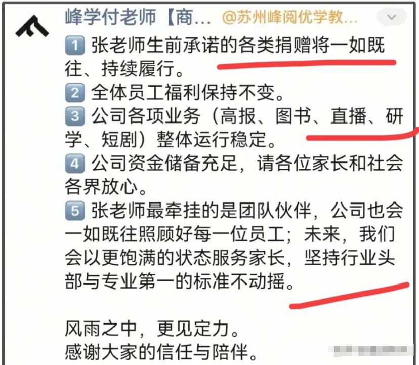 张雪峰去世头七这天,公司总经理武亮发了一篇长文悼念,里面不仅说了对公司未来的安排,还亲口透露了对张雪峰11岁女儿张姩菡的规划,更让人心里发酸的是,武亮在回复里说,已经把张雪峰生前常骑的那辆电瓶车仔细擦拭干净,好好保存起来了。 张雪峰走得突然,3月24日在公司跑步后突发不适,送医抢救无效离世,年仅42岁今日头条。他生前最放心不下的,就是自己一手创办的峰学蔚来和年幼的女儿张姩菡,这也是他最大的牵挂。 很多人都在关心,他有没有立过遗嘱,女儿最终能分到多少财产,毕竟他名下有多家公司,还有过亿存款,总资产预估在5到8亿之间。 武亮的这篇千字文,算是给外界吃了颗定心丸。 武亮不是外人,是张雪峰最信任的人,13年教育行业经验,从基层咨询师做到总经理,当年还是被张雪峰破格提拔的,张雪峰生前就说过他是能扛事的人。这篇长文里,武亮没说太多虚的,实打实讲了两件事,一件关乎公司,一件关乎张雪峰最牵挂的女儿。 武亮说,公司现在一切都好,业务正常运转,员工和学员的权益一点都不会受影响,团队也不会散,他会带着大家把张雪峰的教育事业继续做下去。 这话看着简单,却稳住了所有人的心——峰学蔚来不只是一家公司,更是无数寒门学子的升学希望,张雪峰不在了,武亮能稳稳接住这份担子,没辜负老领导的信任。 更让人暖心的是关于张姩菡的安排,武亮说张雪峰所有的核心资产,包括峰学蔚来的控股权、其他公司的股份,还有那些短视频账号、讲座版权的收益,全都留给了女儿,张雪峰的母亲也能享受养老相关的财产权益,没有任何外人能插手。 为了不让这么小的孩子被巨额财产所累,他们还专门弄了个股权信托,找了专业的律师和财务人员,加上武亮一起帮忙监管这些资产。 简单说,就是现在不用张姩菡管任何事,每月有固定的生活费和教育费,每年还能拿公司分红,所有钱都只用在她的成长和学习上,等她满18岁了,想自己掌管这些财产也行,想安安稳稳过日子也可以,武亮承诺会全力辅佐,绝不干涉她的决定。 张雪峰这辈子都在教别人规划人生,没想到自己的身后事,把女儿的未来安排得这么周全,这份心思真的让人动容。 长文里还有个细节,看着让人鼻子发酸,武亮说已经把张雪峰生前常骑的那辆电瓶车仔细擦干净,好好保存起来了。 谁能想到,一个身价上亿的老板,天天骑的不是豪车,就是一辆普通的电瓶车,每天骑着它上下班、接送女儿,风里来雨里去,车身上还留着常年骑行的划痕。 这辆电瓶车陪着张雪峰走过了最拼的那些年,也藏着他对女儿最朴素的陪伴,武亮把它好好保存着,这哪是保存一辆车啊,分明是守护着张雪峰留下的念想,这份情义比什么都珍贵。 其实张雪峰对女儿的爱,早就藏在细节里了。他女儿的名字张姩菡,是他翻了大半年字典才定下来的,“姩”是希望女儿平安顺遂,不用像他一样吃苦,“菡”是盼着女儿像荷花一样纯净美好,连起来的谐音“念寒”,还藏着他对家乡和初心的牵挂。 他之前在直播里说过,要是女儿学习不好,混个本科就行,想去银行工作,他就把家里的钱存到那家银行,当时还有人调侃他,可现在再看这话,满是一个父亲想给女儿兜底的疼爱。 他走后,张姩菡发文说“天上的文曲星换届了,选中了爸爸”,这么小的孩子,用最天真的话表达着对爸爸的思念,看着真让人心疼。 张雪峰的后事办得特别简朴,按照他的遗愿,不设追思会、不接受祭品,谢绝专程吊唁,可告别仪式上,他老母亲撕心裂肺的哭声,还是让所有人都绷不住了。 白发人送黑发人,是最让人难受的事,可看着武亮稳稳扛起责任,看着张姩菡有这么周全的保障,张雪峰在天有灵,也该能安心了。 现在这个社会,很多人觉得商人重利轻情,可张雪峰和武亮让我们看到了不一样的样子。张雪峰身价上亿却生活简朴,心里装着学员和家人,走之前把一切都安排得明明白白;武亮受人之托忠人之事,不仅守住了公司,更守住了老领导的牵挂,这份担当和情义,真的太难得了。 张雪峰一辈子都在帮别人规划未来,他自己的人生虽然短暂,却活得特别明白、特别有重量。 我们总说生命无常,张雪峰的突然离世也提醒着所有人,健康比什么都重要,再忙也得好好照顾自己。 但更让人感动的是,在无常的命运里,还有这样沉甸甸的信任和守护。 张雪峰走了,但他留下的教育事业还在,留下的爱还在,武亮会带着他的念想继续走下去,张姩菡也会在这份守护下慢慢长大。 愿这个懂事的小姑娘能平安顺遂,不辜负爸爸的疼爱和牵挂,也愿所有为生活奔波的人,都能被岁月温柔以待,既有追梦的勇气,也有守护的底气。