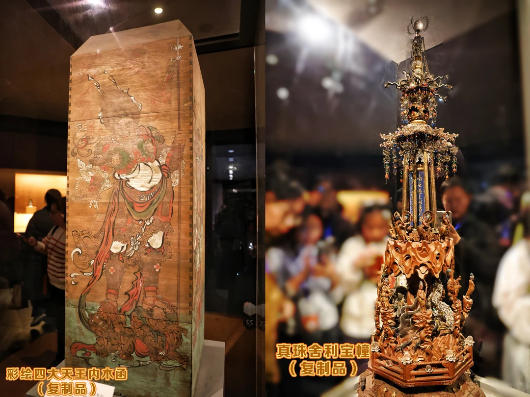 🔎 葫芦形料质舍利瓶(真珠舍利宝幢内藏),这是北宋的国宝级文物!这是被小孩掏鸟窝发现的千年国宝,彩绘四大天王内木函:装着真珠舍宝幢,宝幢用金银、珍珠、宝石装饰,雕刻精细到发丝,可惜除了舍利瓶现场看的都是复刻品!(真品呢?)