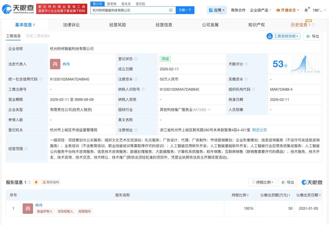 多家一人公司成立于近期 靠AI年营收150万一人公司揭秘男子靠AI开一人公司年营收达150万 据媒体报道,近日,浙江省首个区级OPC(一人公司)专项政策引发热议。 天眼查App显示,受访者相关公司杭州羚柯智能科技有限公司成立于2026年2月,法定代表人为冉伟,注册资本50万人民币,经营范围包括人工智能应用软件开发、人工智能基础软件开发、市场营销策划等,由冉伟全资持股。另一受访者关联公司杭州星境引擎科技有限公司成立于2026年1月,法定代表人为彭镜臣,注册资本10万人民币,经营范围包括人工智能公共数据平台、人工智能应用软件开发、虚拟现实设备制造等。股东信息显示,该公司由彭镜臣、北京天娇星辰文化传媒有限公司共同持股。 天眼查信息: