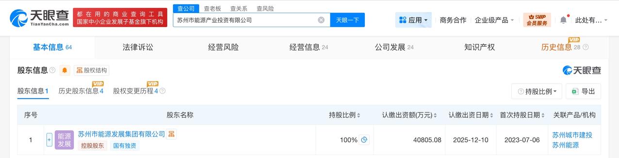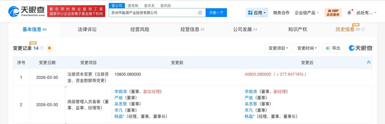 苏州市能源产业投资公司增资至4.1亿 增幅约278% 天眼查工商信息显示,近日,苏州市能源产业投资有限公司发生工商变更,注册资本由约1.1亿人民币增至约4.1亿人民币,增幅约278%。 该公司成立于1999年5月,法定代表人为韩晶,经营范围包括以自有资金从事投资活动、自有资金投资的资产管理服务、合同能源管理等。股东信息显示,该公司由苏州市能源发展集团有限公司全资持股。 天眼查信息: