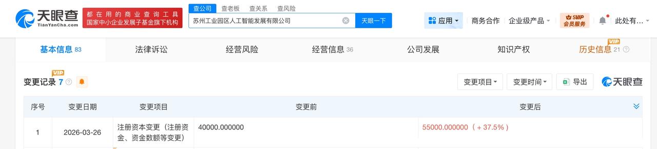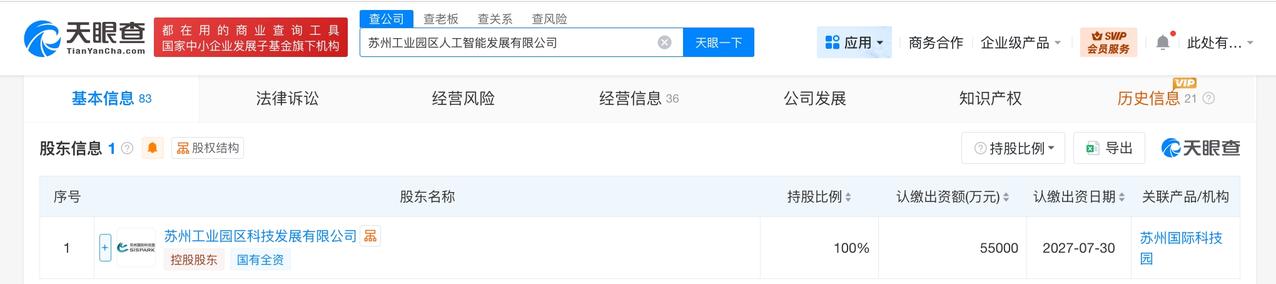 苏州工业园区人工智能发展公司增资至5.5亿 增幅37.5% 天眼查工商信息显示,近日,苏州工业园区人工智能发展有限公司发生工商变更,注册资本由4亿人民币增至5.5亿人民币,增幅37.5%。 该公司成立于2017年11月,法定代表人为张峰,经营范围包括人工智能产业园开发、建设、管理,创业孵化管理,人工智能项目投资等。股东信息显示,该公司由苏州工业园区科技发展有限公司全资持股。 天眼查信息: