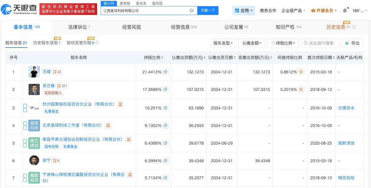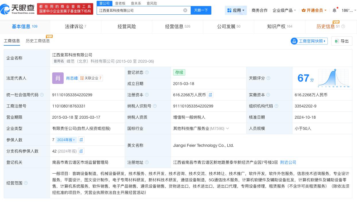 汪峰持股斐耳科技被限消 汪峰持股科技公司被限消 天眼查天眼风险信息显示,近日,江西斐耳科技有限公司及法定代表人肖某新增一则限制消费令,执行法院为苏州工业园区人民法院。案件流程信息显示,此前,该公司已因此案被执行约41万余元。 江西斐耳科技有限公司成立于2015年3月,注册资本约616万人民币,经营范围包括音响设备制造、机械设备研发、电子产品销售、通讯设备销售等。股东信息显示,该公司由汪峰、吴世春等共同持股。 天眼查信息: