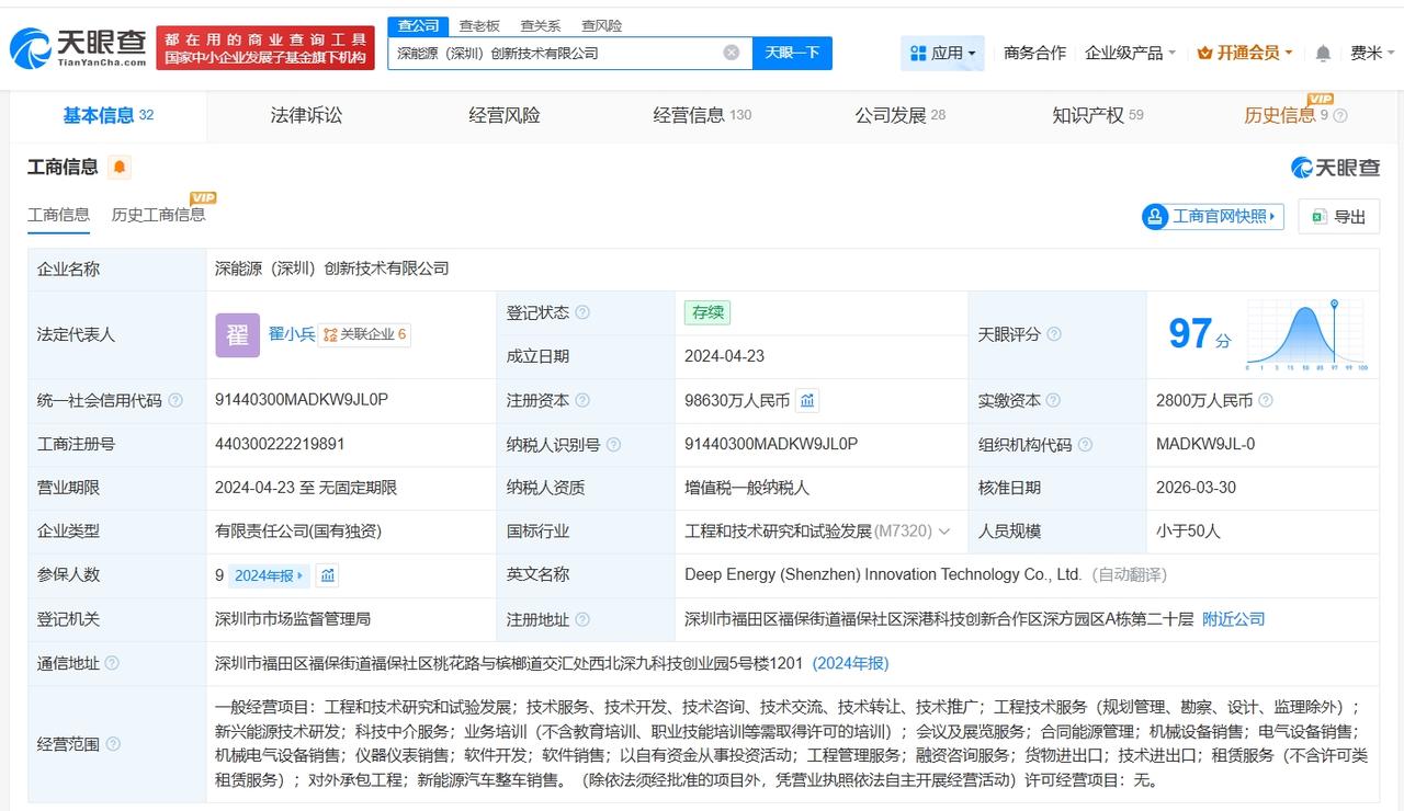 深圳能源旗下创新技术公司增资至9.9亿 增幅约3423% 天眼查App显示,近日,深能源(深圳)创新技术有限公司发生工商变更,注册资本由2800万人民币增至约9.9亿人民币,增幅约3423%。 该公司成立于2024年4月,法定代表人为翟小兵,经营范围包括工程和技术研究和试验发展、新兴能源技术研发、合同能源管理、软件开发等,由深圳能源(000027)全资持股。 天眼查信息: