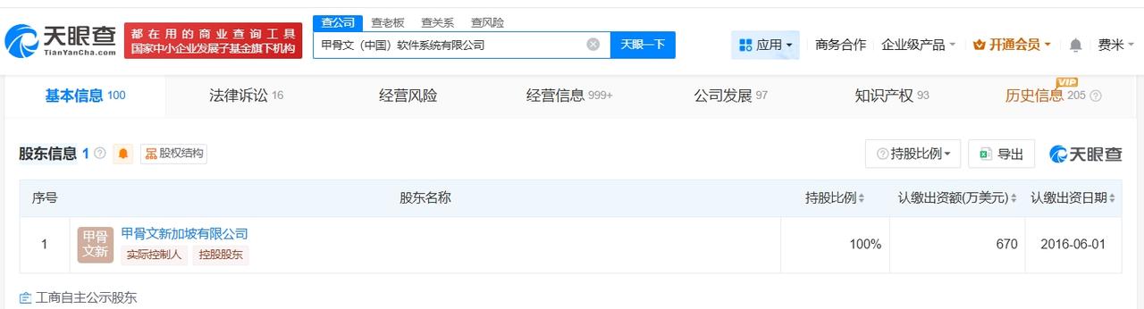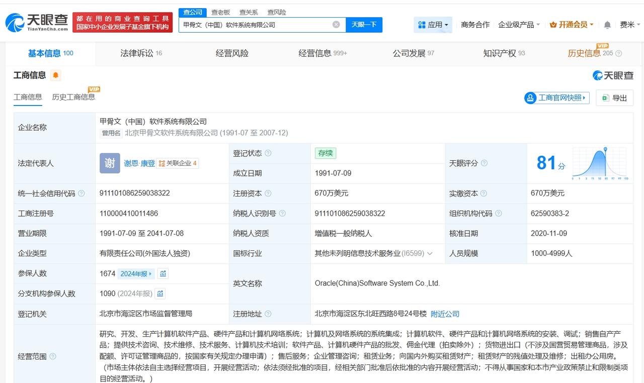 甲骨文中国涉多起劳动争议纠纷 甲骨文中国曾因劳动合同纠纷被起诉甲骨文凌晨6点突发裁员3万人 据媒体报道,近日,甲骨文被曝凌晨6点突发裁员3万人,相关话题引发热议。 天眼查App显示,甲骨文(中国)软件系统有限公司成立于1991年7月,法定代表人为谢恩·康登,注册资本670万美元,经营范围包括研究、开发、生产计算机软件产品、硬件产品和计算机网络系统等,由甲骨文新加坡有限公司全资持股。法律诉讼信息显示,该公司曾因劳动争议、劳动合同纠纷等被起诉。 天眼查信息: