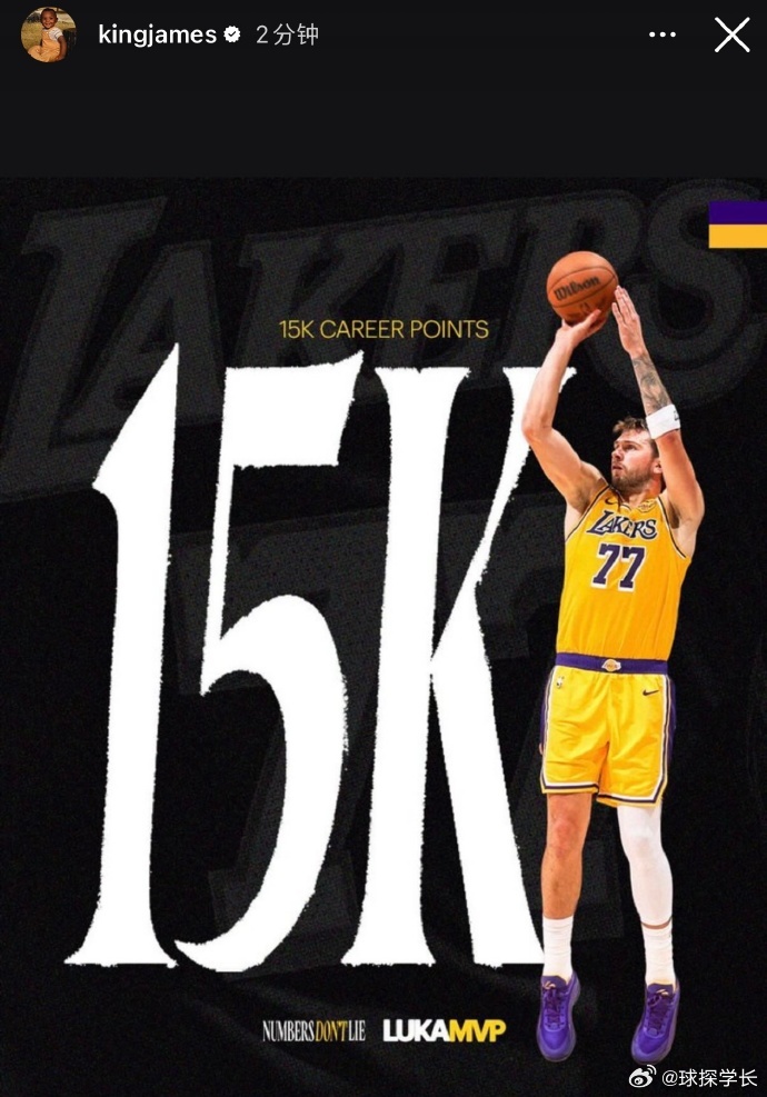 詹姆斯更新社媒,表达了祝贺:东契奇生涯15000分八村塁生涯5000分雷迪克生涯