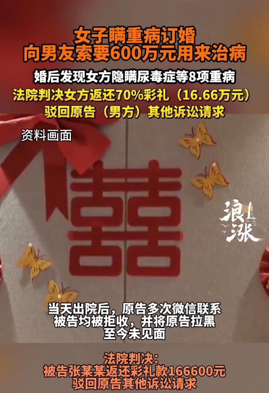 刚认识前两天就订婚,女子隐瞒自己患尿毒症,糖尿病的事实。订婚后男方付188000的彩礼加三金。在一起生活后,女方得告知男方自己有病,让男方贷款600万给她看病。