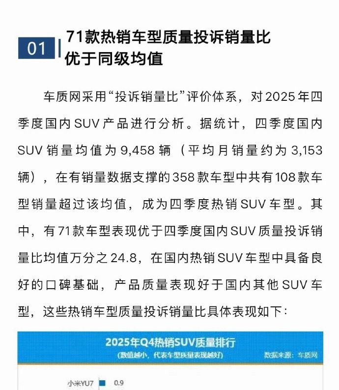 IQS分数越低越好,SU7在细分冠军里分值最低,这质量不是吹的。之前车质网报告YU7也是第一,再加上全网各种拆车视频,用料做工经得起放大镜看,榜单不过是给个官方认证罢了。