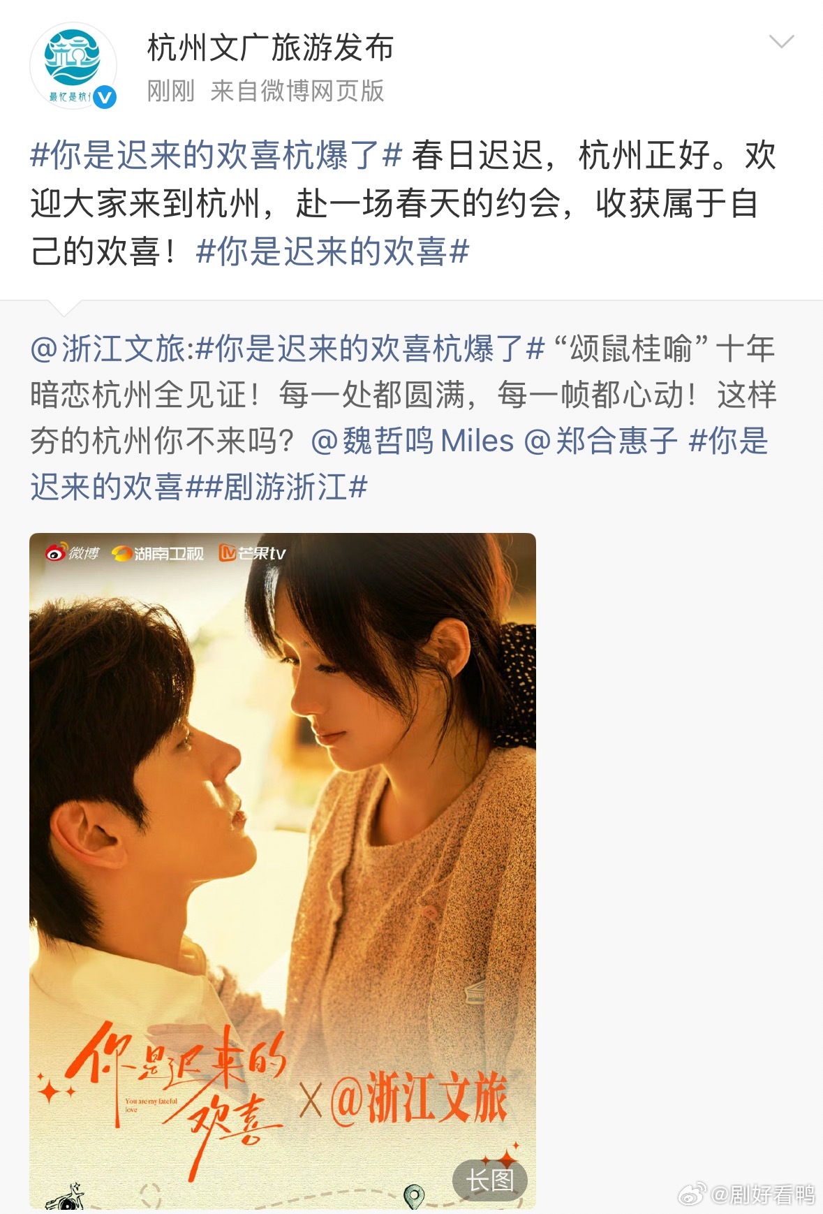 浙江文旅喊话魏哲鸣郑合惠子杭州真是让人这辈子都会想去的地方,你是迟来的欢喜里魏哲鸣郑合惠子两个人的暗恋小故事,真的和慢节奏的诗情画意很配了