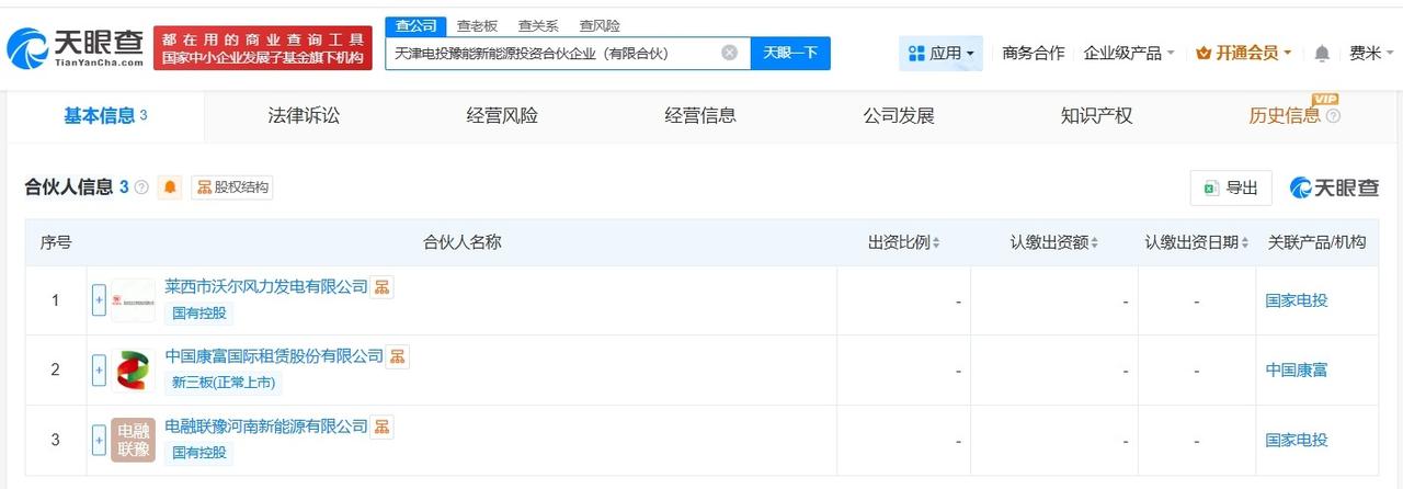 中国康富等在天津成立新能源投资合伙企业 出资额38.36亿 天眼查App显示,近日,天津电投豫能新能源投资合伙企业(有限合伙)成立,执行事务合伙人为莱西市沃尔风力发电有限公司,出资额38.36亿人民币,经营范围为以自有资金从事投资活动。合伙人信息显示,该合伙企业由莱西市沃尔风力发电有限公司、中国康富国际租赁股份有限公司、电融联豫河南新能源有限公司共同出资。 天眼查信息: