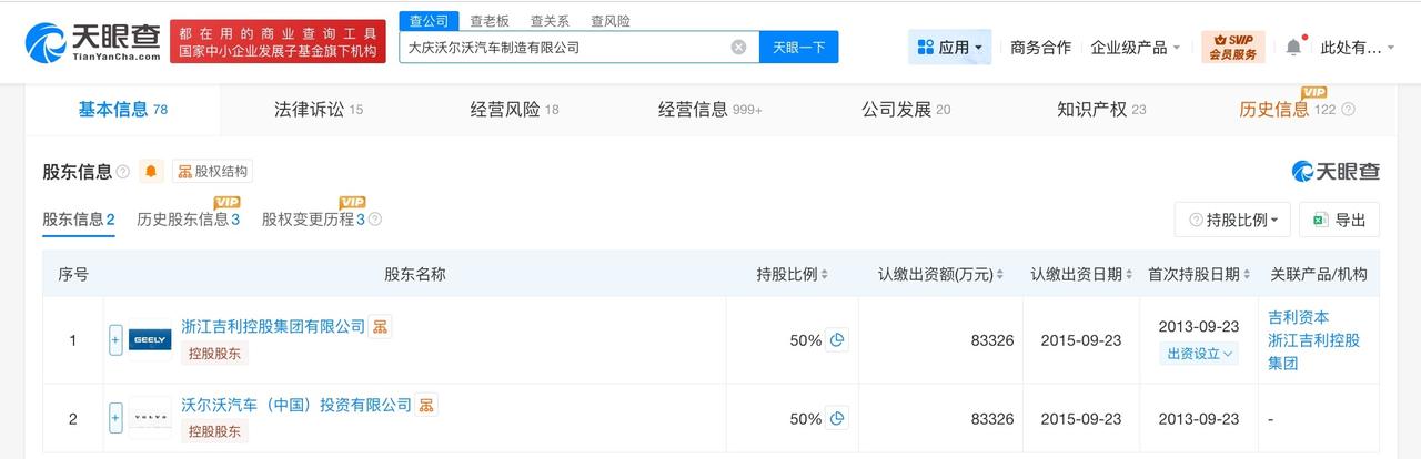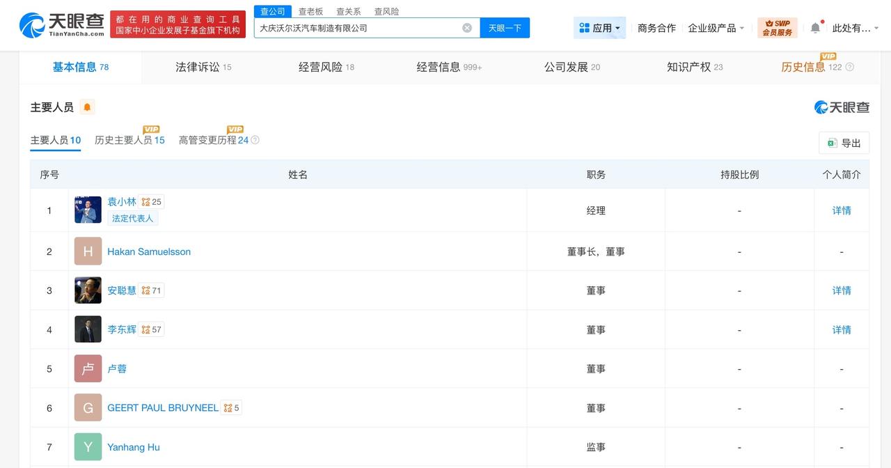 袁小林卸任大庆沃尔沃公司董事长 吉利沃尔沃合资公司董事长变更 天眼查工商信息显示,近日,大庆沃尔沃汽车制造有限公司发生工商变更,袁小林由董事长、经理变更为经理,由HKAN SAMUELSSON接任董事长,李东辉卸任副董事长,同时,多位高管发生变更。 大庆沃尔沃汽车制造有限公司成立于2013年9月,法定代表人为袁小林,注册资本约16.7亿人民币,经营范围含制造汽车及其零部件,销售、分销和出口合资公司和合资公司投资企业制造的产品,从事国产沃尔沃汽车的出口,汽车相关技术的研发等。股东信息显示,该公司由浙江吉利控股集团有限公司、沃尔沃汽车(中国)投资有限公司各持股50%。 天眼查信息: