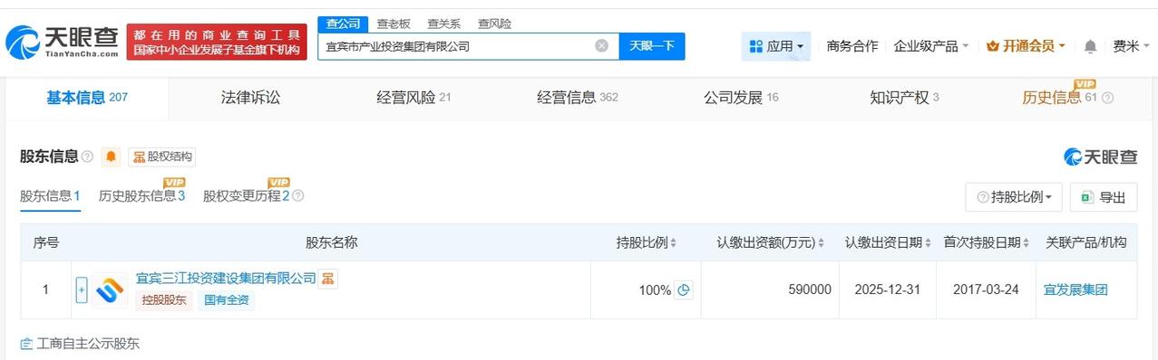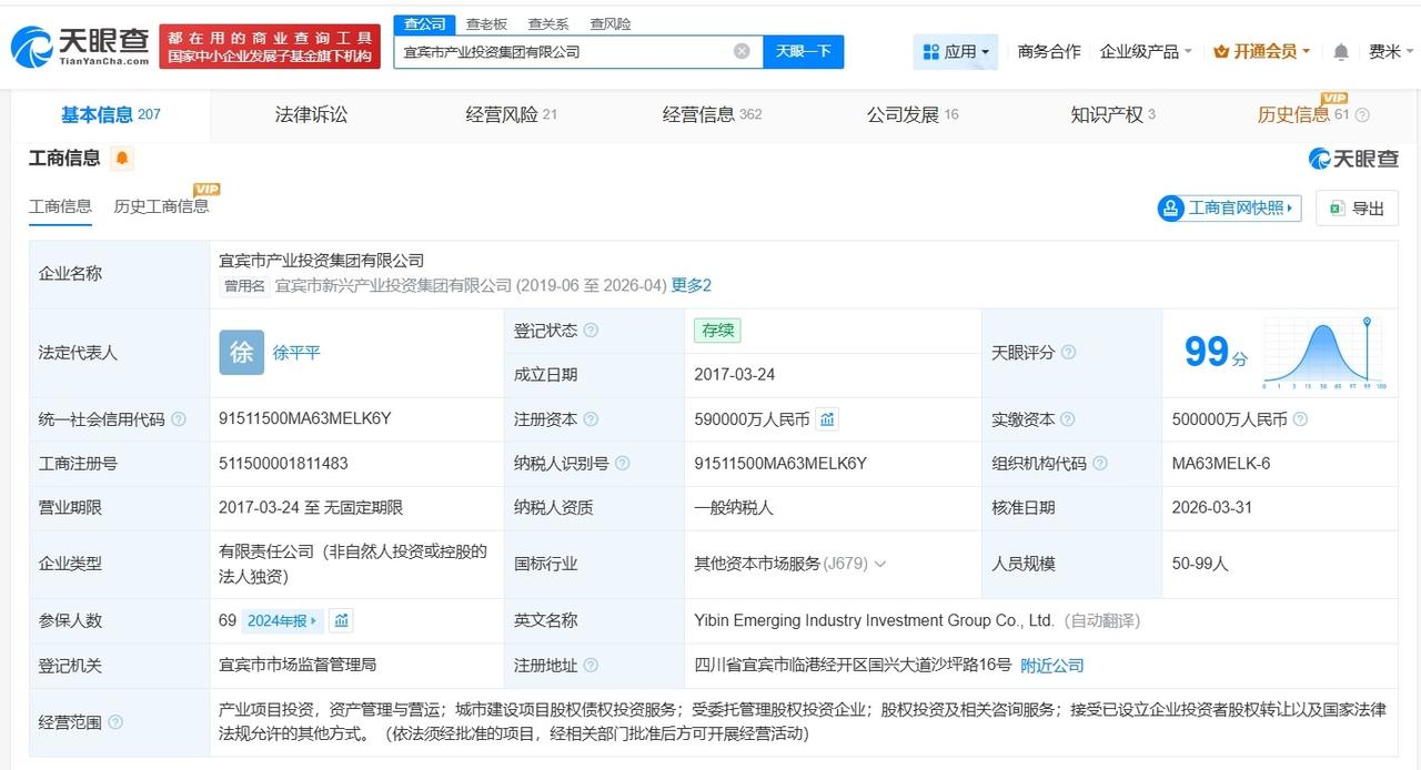 宜宾市产业投资集团完成更名 宜宾市产业投资集团增资至59亿 天眼查App显示,近日,宜宾市新兴产业投资集团有限公司发生工商变更,企业名称变更为宜宾市产业投资集团有限公司,同时,注册资本由54亿人民币增至59亿人民币。 该公司成立于2017年3月,法定代表人为徐平平,经营范围包括产业项目投资、资产管理与营运、股权投资及相关咨询服务等,由宜宾三江投资建设集团有限公司全资持股。 天眼查信息: