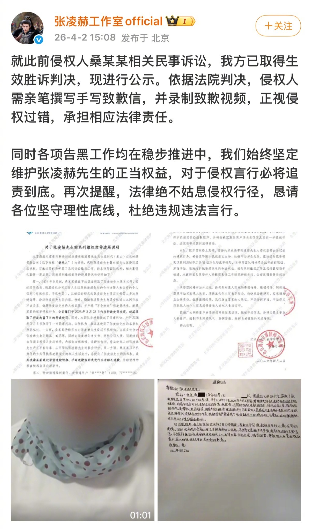 发文公示告黑胜诉!!侵权人已亲笔手写致歉信并录制致歉视频。 张凌赫告黑胜诉