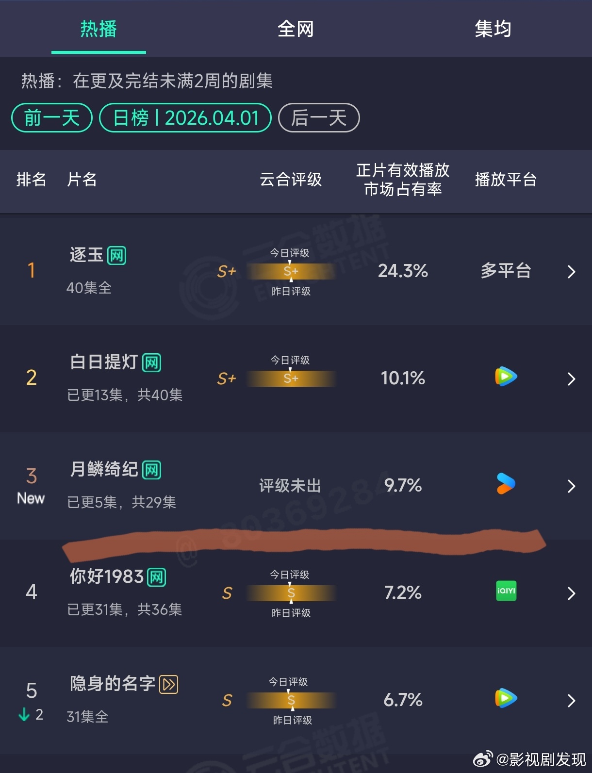 月鳞绮纪首日云合占比9.7%,快赶上开播好几天的白日提灯了