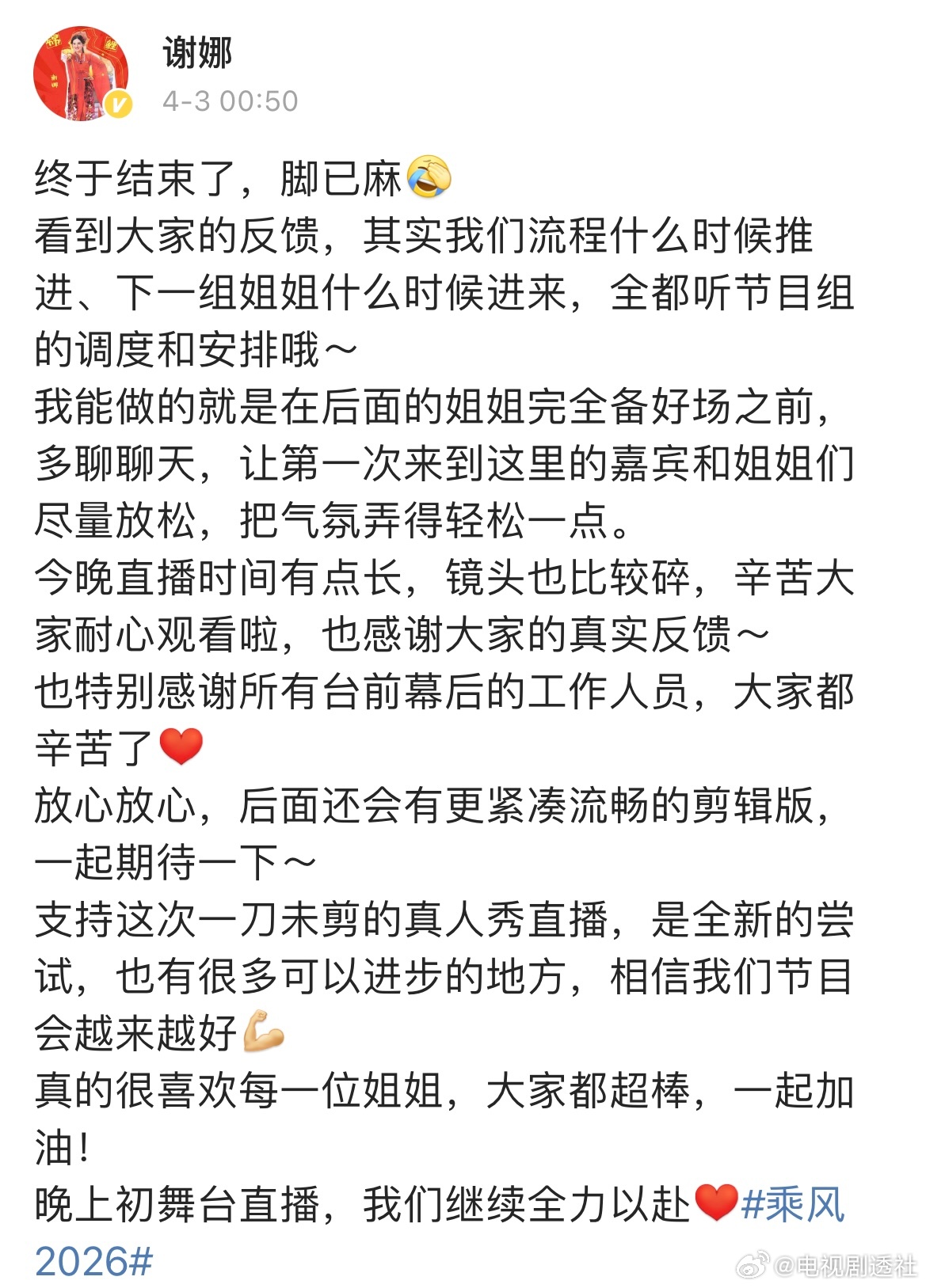 谢娜发文回应乘风直播节奏慢谢娜说全都听节目组的调度和安排谢娜感谢大家的真实反馈 终于结束了,脚已麻看到大家的反馈,其实我们流程什么时候推进、下一组姐姐什么时候进来,全都听节目组的调度和安排哦~我能做的就是在后面的姐姐完全备好场之前,多聊聊天,让第一次来到这里的嘉宾和姐姐们尽量放松,把气氛弄得轻松一点。今晚直播时间有点长,镜头也比较碎,辛苦大家耐心观看啦,也感谢大家的真实反馈~也特别感谢所有台前幕后的工作人员,大家都辛苦了放心放心,后面还会有更紧凑流畅的剪辑版,一起期待一下~支持这次一刀未剪的真人秀直播,是全新的尝试,也有很多可以进步的地方,相信我们节目会越来越好真的很喜欢每一位姐姐,大家都超棒,一起加油!晚上初舞台直播,我们继续全力以赴