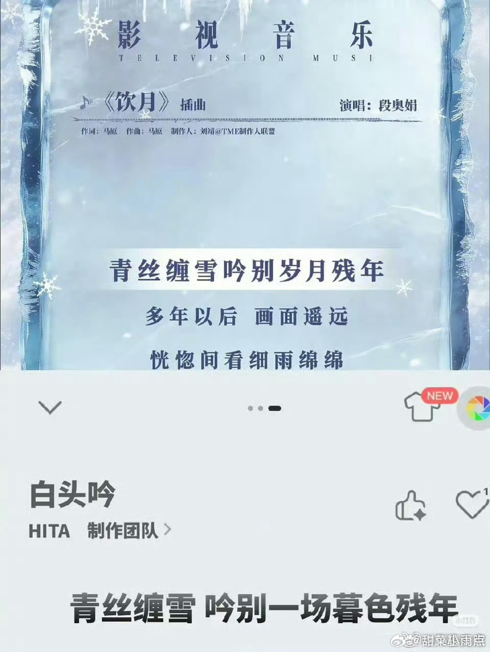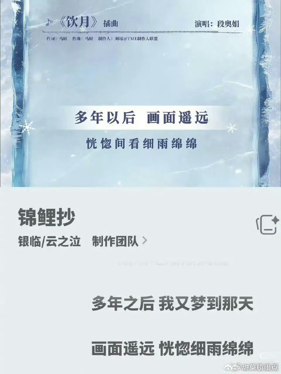 李昀锐 黄杨钿甜《冰湖重生》OST歌词被扒出直接照搬三首经典古风歌——《伶仃谣》《白头吟》《锦鲤抄》,句式、意境、用词都高度重合。这操作让本来就糊的剧雪上加霜…