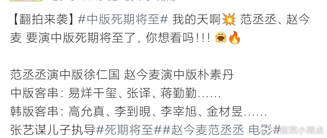 网传范丞丞 赵今麦搭档翻拍《死期将至》看简介说女主就是个工具人,范丞丞能压番赵今