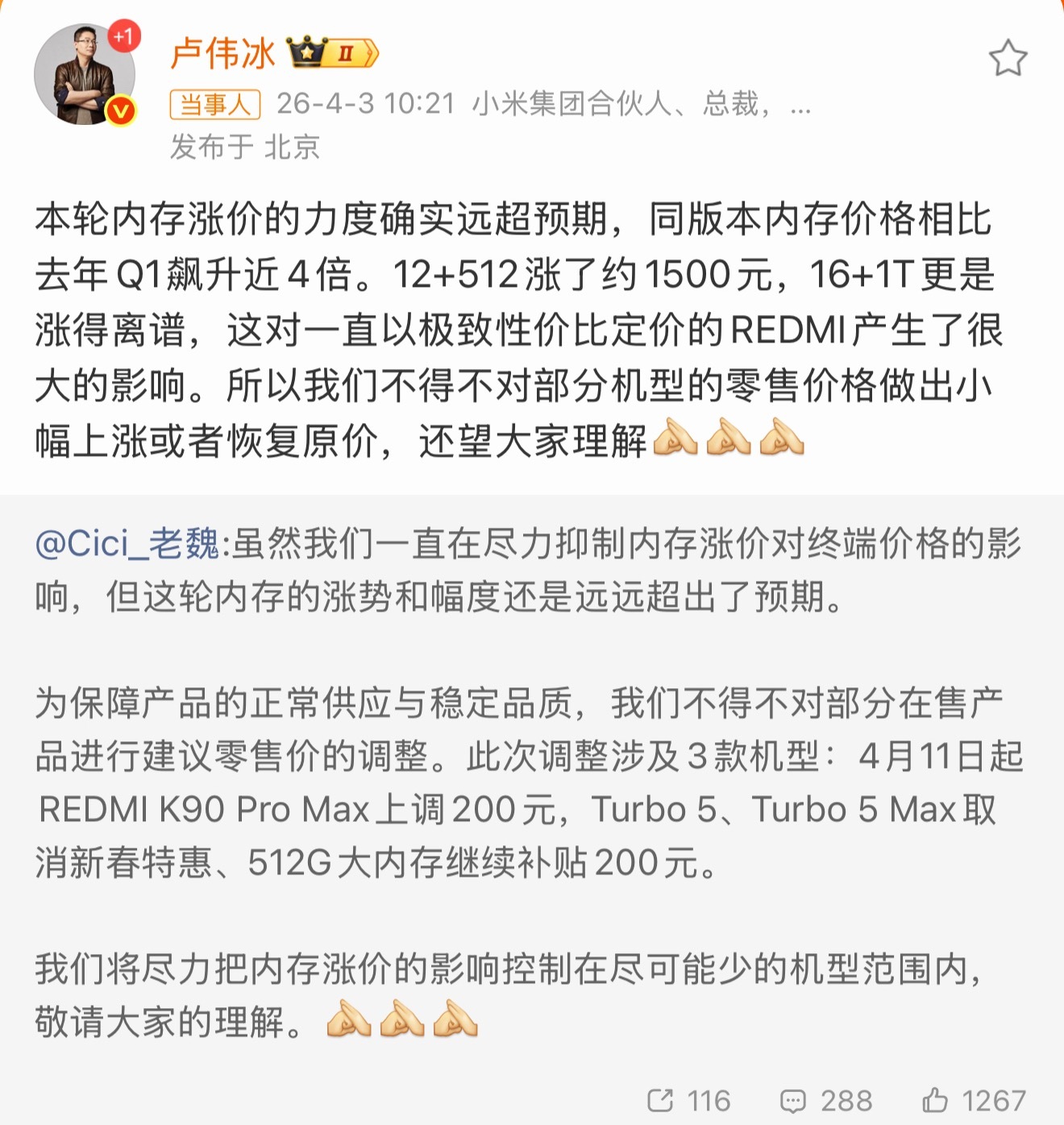 小米这波操作我觉得挺厚道,512G版本还留着200补贴,没像有些品牌直接砍1TB版本。现在旧机涨500、新机涨1000已成行业常态,早买真的早享受,等2027年新产能出来黄花菜都凉了。国产存储加油冲吧,长鑫成本低15%-20%,希望早点能顶上。