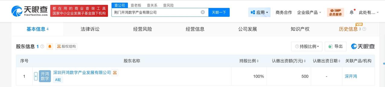 深开鸿在荆门成立数字产业公司 注册资本500万 天眼查工商信息显示,近日,荆门开鸿数字产业有限公司成立,法定代表人为王波,注册资本500万人民币,经营范围包括信息系统集成服务、软件开发、物联网技术研发、人工智能行业应用系统集成服务等。股东信息显示,该公司由深圳开鸿数字产业发展有限公司全资持股。 天眼查信息: