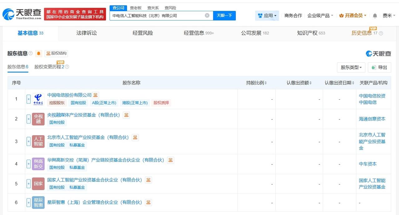 中电信人工智能科技公司增资至约33.7亿 增幅约12% 天眼查App显示,近日