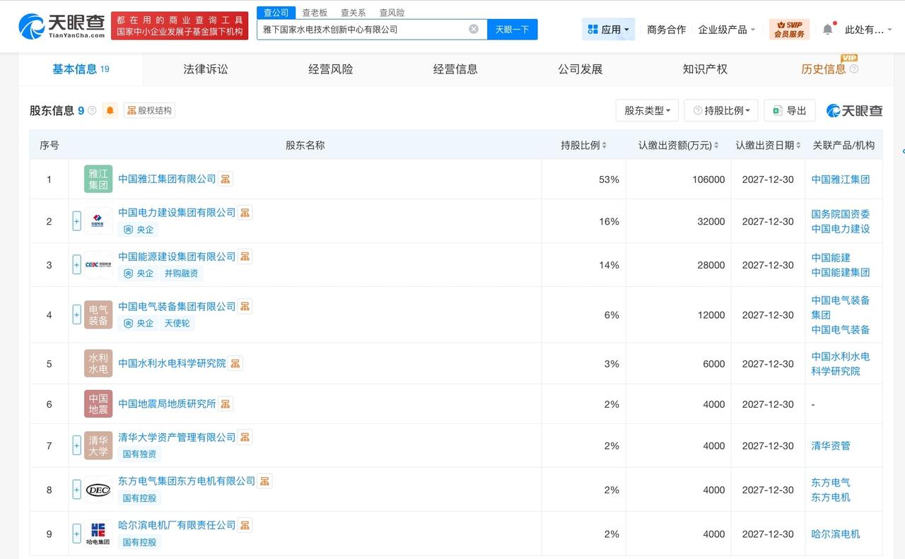 中国雅江集团等成立国家水电技术创新中心公司 注册资本20亿 天眼查工商信息显示
