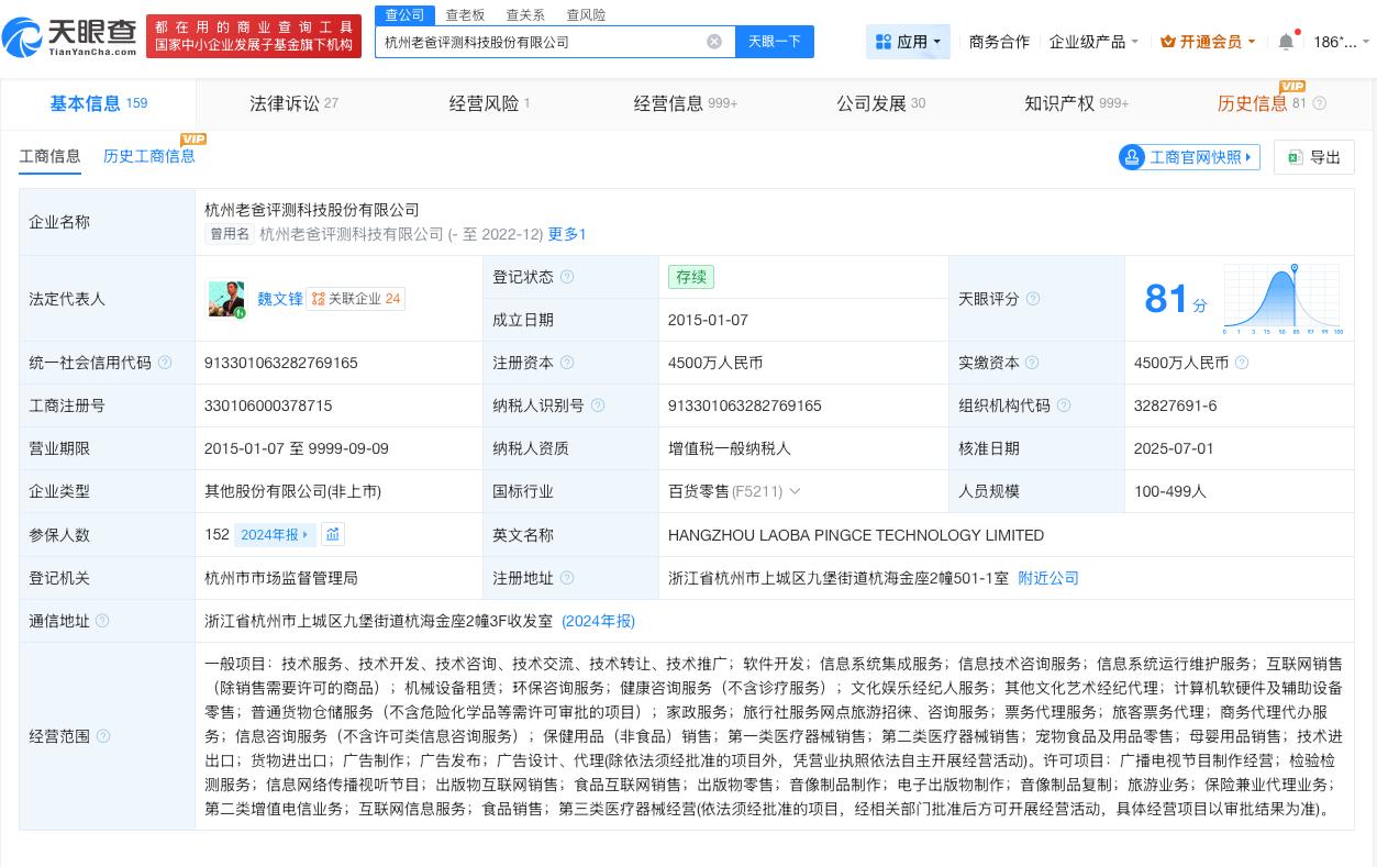 老爸评测已注册老爸商城商标 老爸评测涉多起纠纷老爸评测就优思益事件道歉 4月2日,测评机构“老爸评测”客服就优思益发布情况说明并致歉。 天眼查工商信息显示,杭州老爸评测科技股份有限公司成立于2015年1月,法定代表人为魏文锋,注册资本4500万人民币,经营范围含互联网销售、环保咨询服务、健康咨询服务、文化娱乐经纪人服务等。股东信息显示,该公司由杭州北溟控股有限公司、魏文锋等共同持股。 知识产权信息显示,该公司已申请注册多枚“老爸家的定制”“老爸家装”“老爸商城”“老爸严选”“老爸优选”等商标,国际分类涉及燃料油脂、饲料种籽、啤酒饮料等,当前商标状态多为已注册。法律诉讼信息显示,该公司曾因名誉权纠纷、不正当竞争纠纷等被起诉。 天眼查信息: