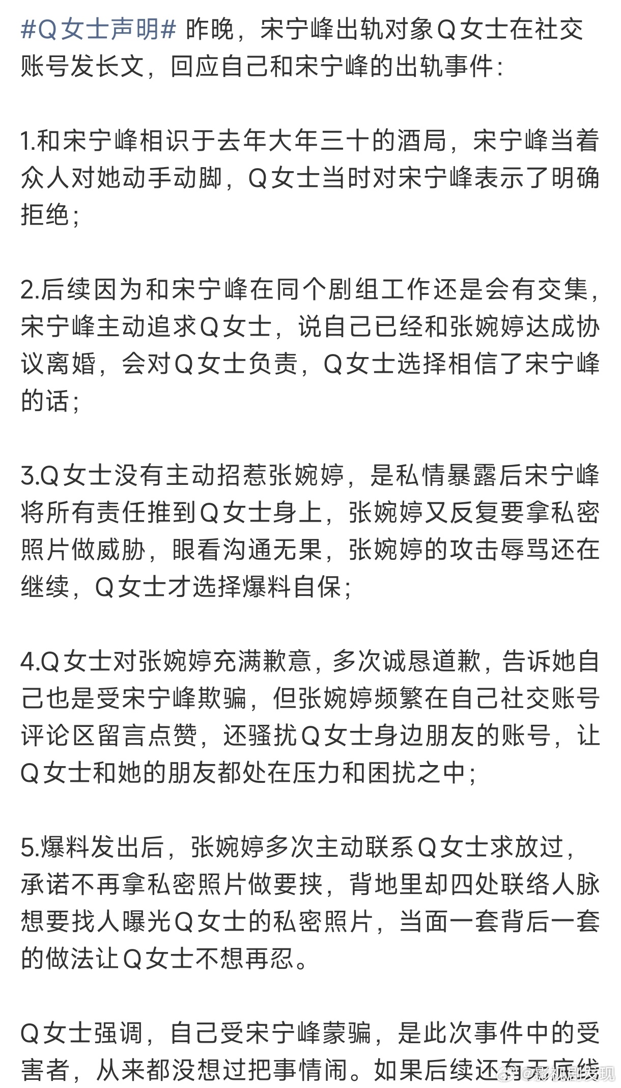 Q女士声明看到这份声明我有两点比较震惊!一是宋宁峰和张婉婷竟然还没有离婚?还以为再见爱人之后就分开了呢!二是宋宁峰婚内出轨是近期才发生的事,还以为是很久之前的事被爆出来了……吃瓜还是要吃全,哈哈哈哈哈哈哈哈哈哈不过要对Q女士说一声去年没有年三十