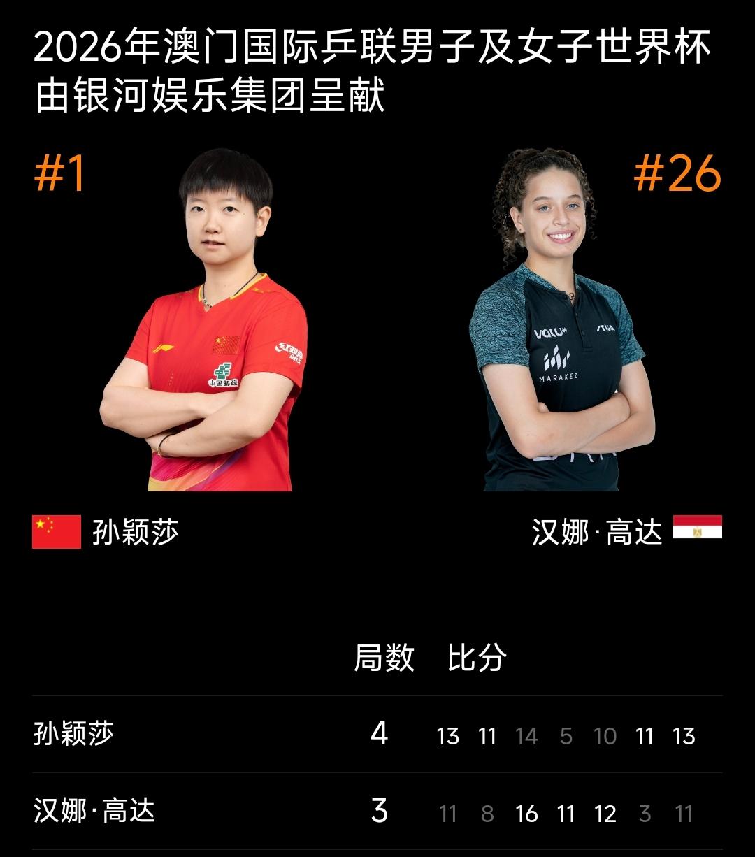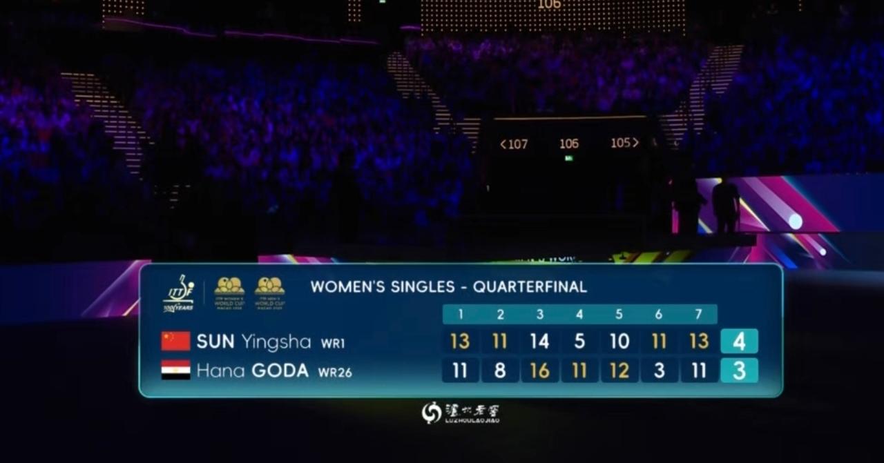 2026年澳门国际乒联世界杯女单1/4决赛上演史诗级对决,世界排名第一的孙颖莎与埃及18岁新星汉娜·高达鏖战七局,在决胜局8-10落后、手握两个赛点的绝境中完成惊天逆转,最终以4-3(13-11、11-8、14-16、5-11、10-12、11-3、13-11)险胜对手,惊险晋级四强!