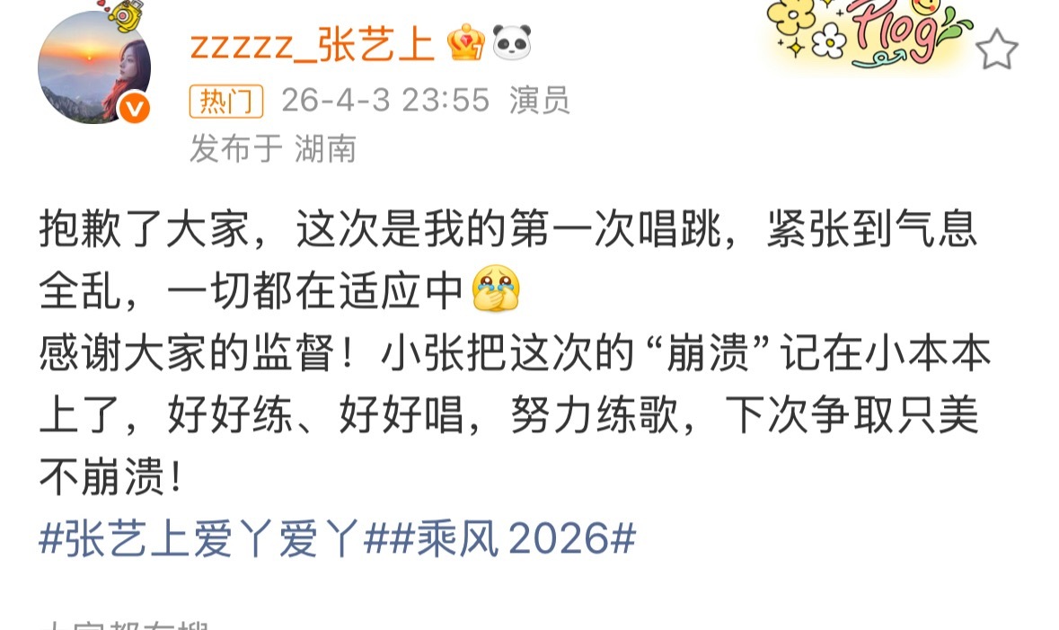 张艺上 下次争取只美不崩溃张艺上直言自己下次争取只美不崩溃,作为第一次唱跳确实也