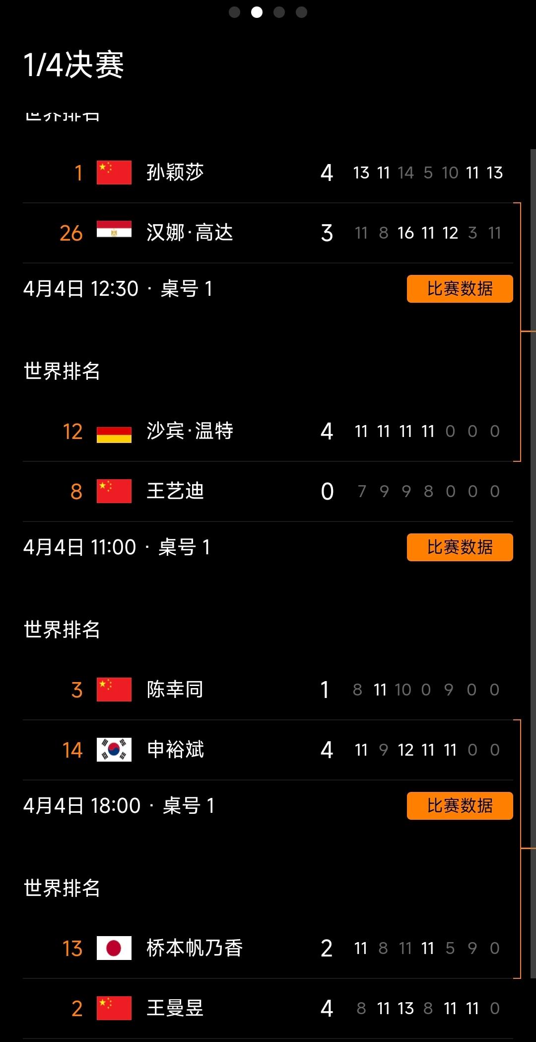 澳门世界杯女单1/4决赛战罢:国乒孙颖莎王曼昱晋级,四强对阵出炉! 北京时间4月4日,2026年国际乒联澳门世界杯女单1/4决赛激战收官。经过四场强强对话,最终世界第一孙颖莎、世界第二王曼昱携手德国名将沙宾·温特、韩国选手申裕斌晋级四强,半决赛对阵也随之确定。 首场对决中,世界第一孙颖莎与埃及选手汉娜·高达上演七局大战。首局孙颖莎迅速进入状态,以11-8、11-8连下两城,随后高达凭借凌厉的进攻以16-14、11-12、12-10连扳三局,率先拿到赛点。绝境之下孙颖莎顶住压力,以11-3、13-11连追两局,最终4-3惊险逆转,有惊无险闯入四强。 第二场比赛爆出冷门,世界排名第12位的德国选手沙宾·温特状态神勇,以4-0横扫国乒主力王艺迪,四局比分11-7、11-9、11-9、11-8,全程压制对手,强势晋级半决赛,这也是温特职业生涯首次闯入世界杯女单四强。 第三场对决中,韩国选手申裕斌延续火热状态,以4-1击败世界第三陈幸同,四局比分11-8、9-11、12-10、11-0、11-9,其中第四局打出11-0的悬殊比分,展现出极强的竞技状态,成功晋级。 最后一场焦点战,王曼昱迎战日本选手桥本帆乃香。双方激战六局,王曼昱在胶着的对抗中把握关键分,最终以4-2(8-11、11-8、13-11、8-11、11-5、11-9)战胜对手,拿到最后一个四强席位。 至此,澳门世界杯女单四强全部产生,半决赛对阵为:孙颖莎对阵沙宾·温特,申裕斌对阵王曼昱,两场比赛将于4月5日上午先后打响,国乒双将将向决赛席位发起冲击,争夺冠军归属。