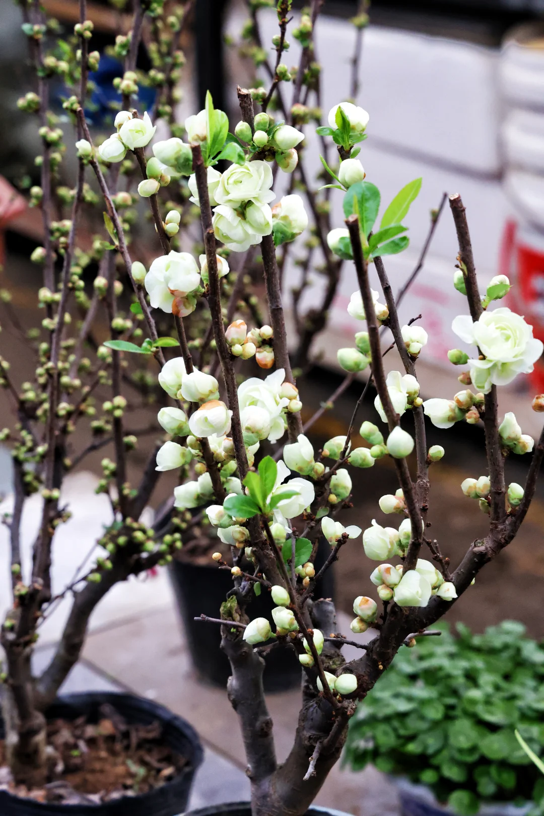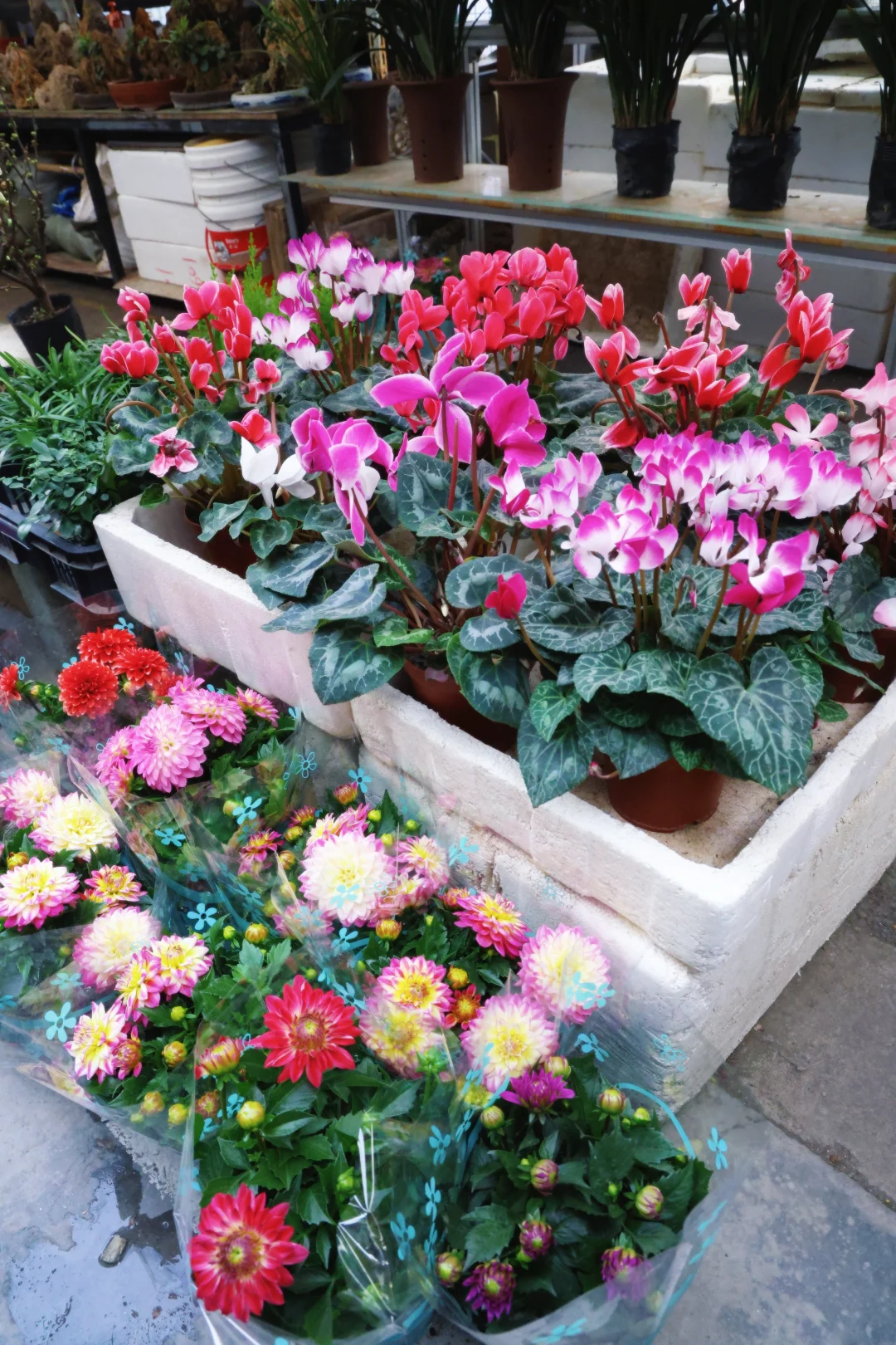 仙客来开得热热闹闹,重瓣海棠的花苞嫩到出水,还有满盆的水仙、小雏菊,每一盆都在疯狂招手,根本走不动道!