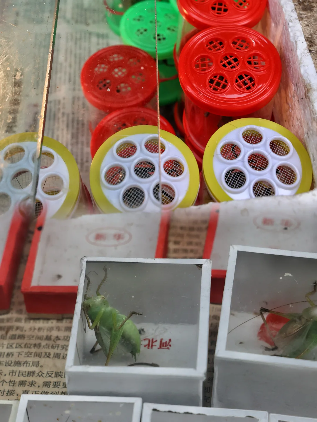 一个个小盒子里装着蝈蝈、蛐蛐,隔着玻璃都能感受到它们的活力,我们一家只在书上看过蛐蛐和蝈蝈,长什么样真的不知道呢。