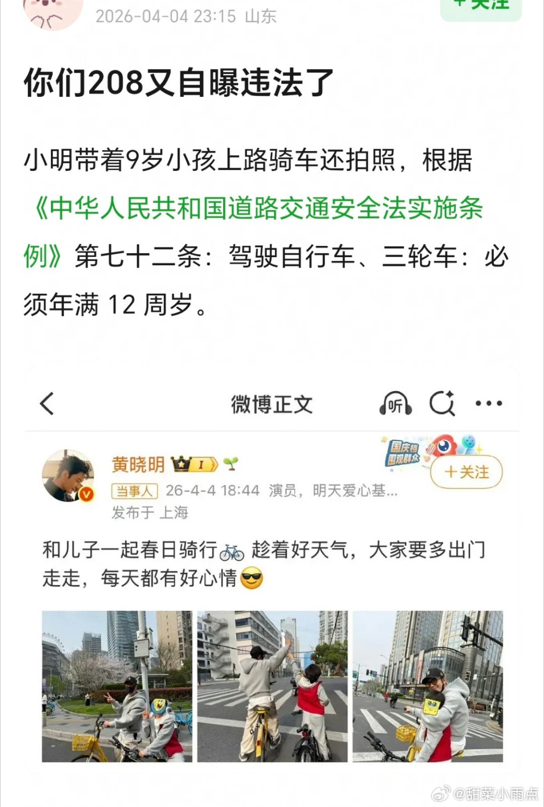 黄晓明晒和儿子春日骑行照黄晓明好不容易晒一次跟儿子小海绵的互动照。被网友指出不应该带着9岁小孩骑车上路还拍照称自行车必须年满12周岁…你怎么看