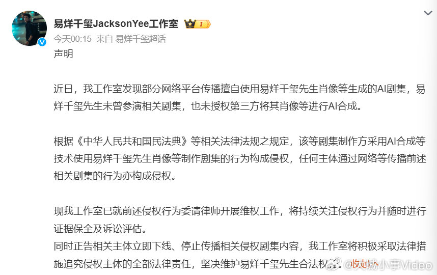 近日,工作室发现部分网络平台传播擅自使用易烊千玺先生肖像等生成的AI剧集,易烊千玺先生未曾参演相关剧集,也未授权第三方将其肖像等进行AI合成。现工作室已就前述侵权行为委请律师开展维权工作。同时正告相关主体立即下线、停止传播相关侵权剧集内容,工作室将积极采取法律措施追究侵权主体的全部法律责任。