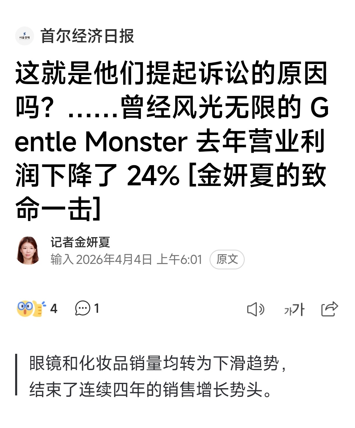 韩网一则新闻显示,曾经蓬勃发展、以“Jennie眼镜”而闻名的Gentle Monster公司五年来首次出现销售额下滑,在2025年与Jennie结束合约后,该公司营业利润下降超过24%!该公司眼镜与化妆品品牌的销售额均有所下降,连续四年的增长势头已经停滞。此前,仅凭借“Jennie的太阳镜”这一热门话题,Gentle Monster在2020年一年就创造了2095亿韩元的销售额,随后4年开始疯狂上涨,截止到2024年销售额为7891亿韩元,但在2025年却开始销售额下滑的现象。