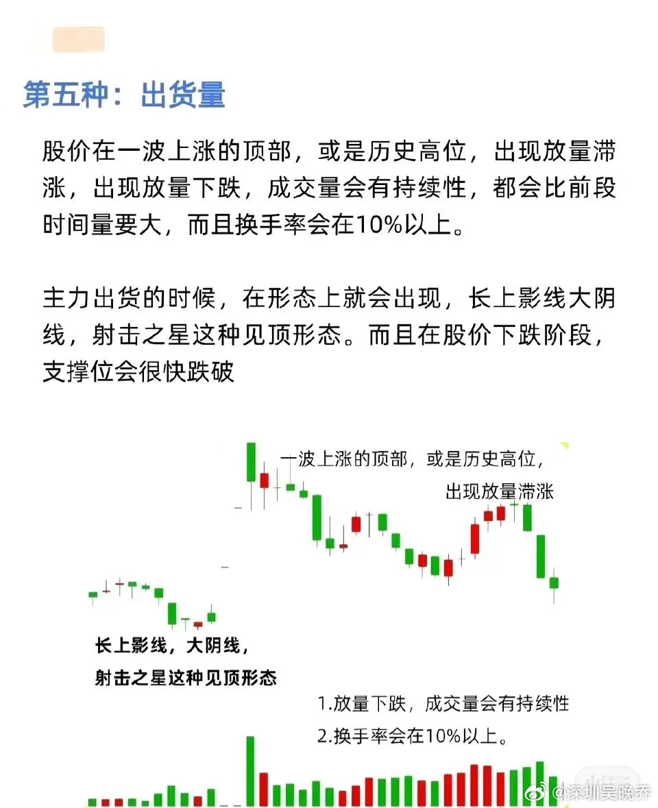 出现在一波上涨的顶部或历史高位,表现为放量滞涨或放量下跌,成交量具有持续性(高于前期),且换手率通常在10%以上。