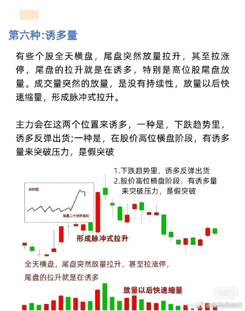 - 下跌趋势中,诱多反弹以出货;- 高位横盘阶段,以“诱多量”制造假突破压力位的假象。