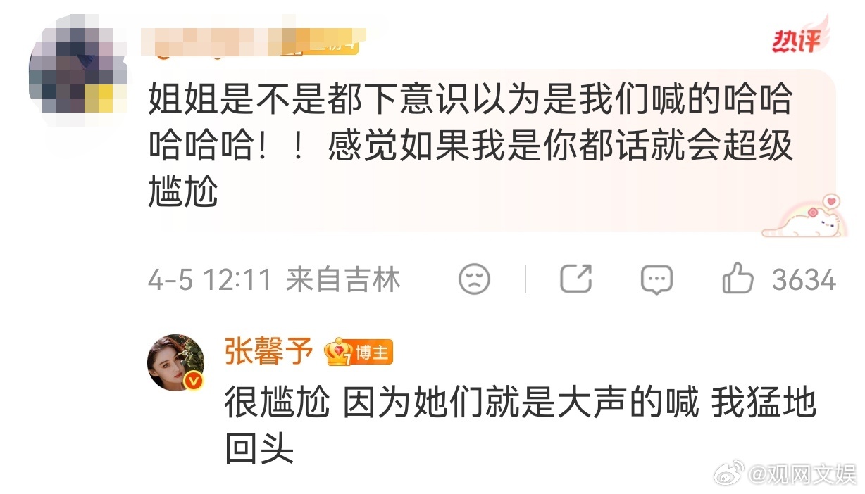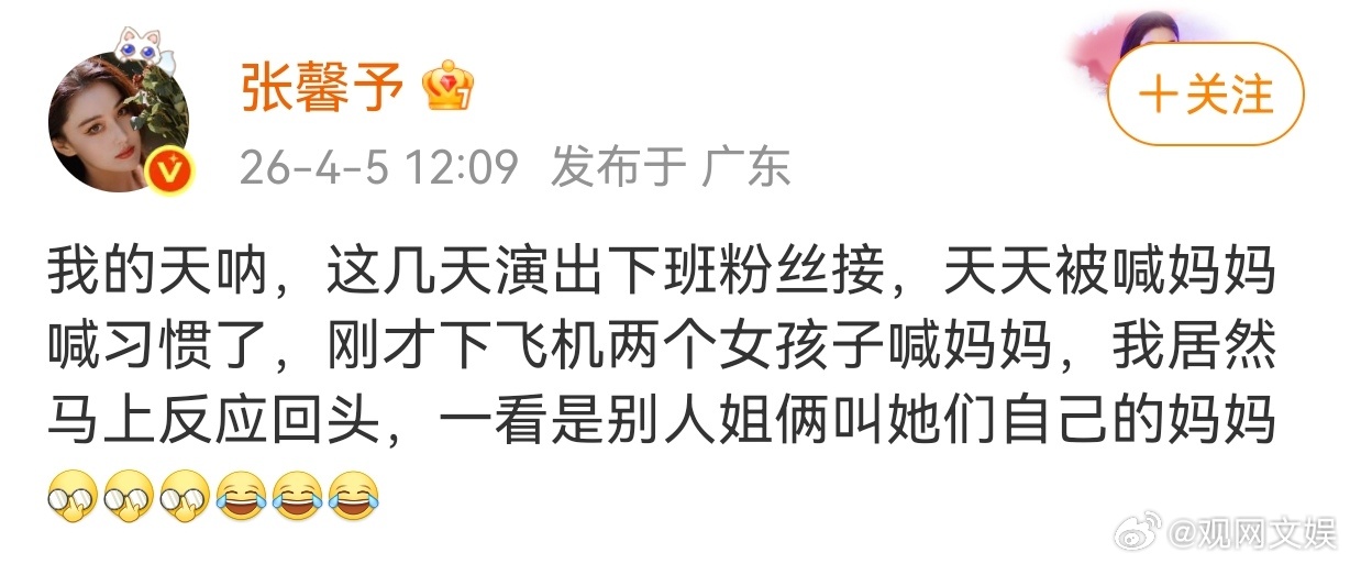 张馨予听到别人喊妈妈以为是粉丝4日,发文说下飞机时听到两个女孩喊妈妈,因为粉丝经常对她这么喊,所以她就马上回头,结果发现别人是在喊自己的妈妈。张馨予在评论说很尴尬