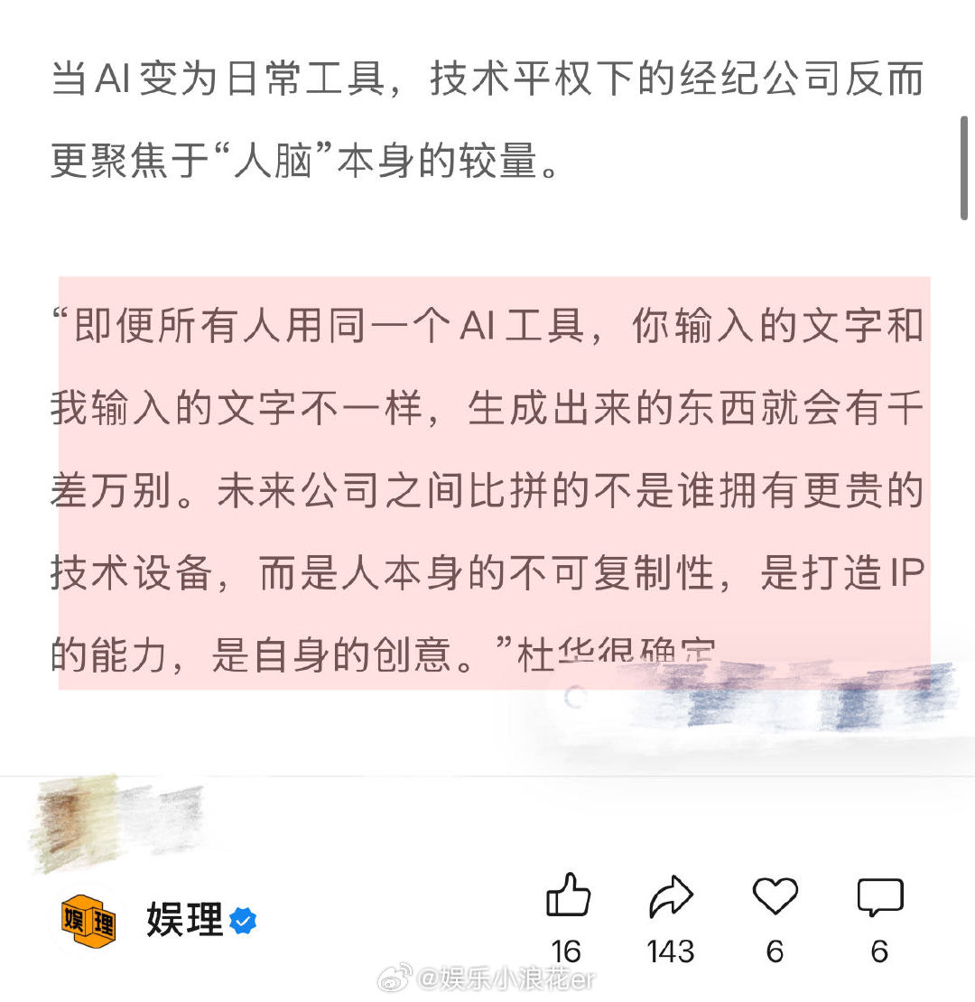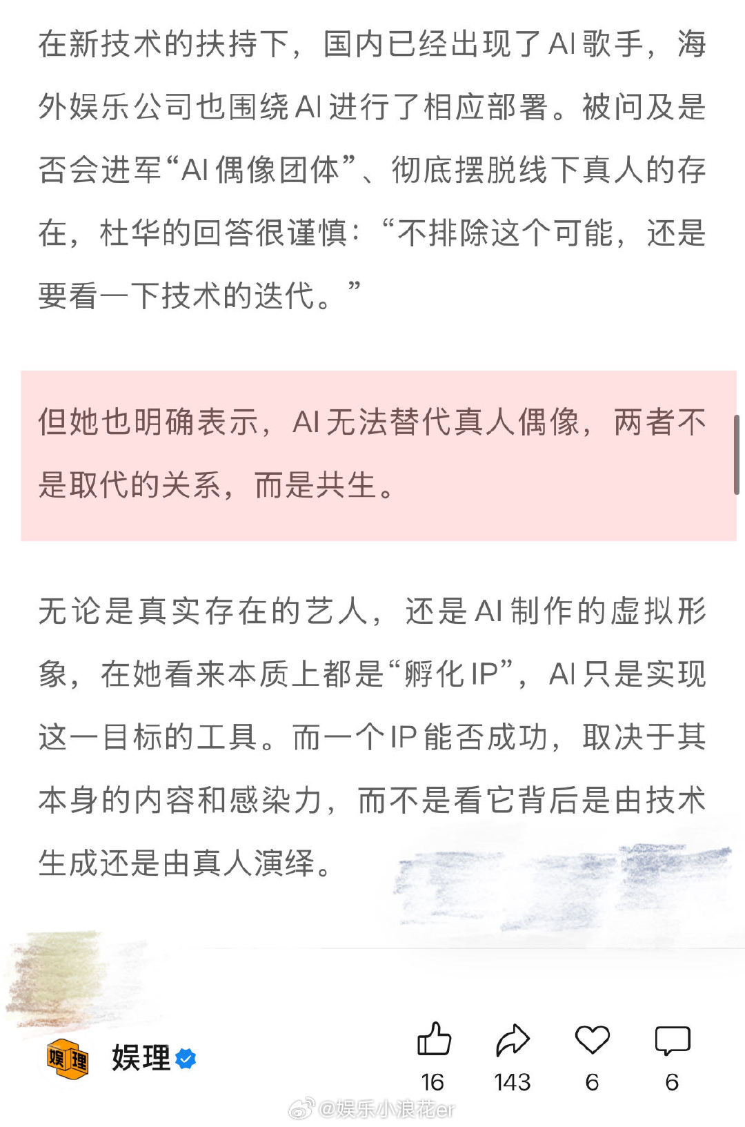 杜华谈真人偶像不会被AI取代 杜华说AI把过去的打法都颠覆了 杜华说真人偶像的价值在于不可复制性,即便AI技术再发达,真人的情感、魅力、现场表演的感染力等等,这些都是虚拟形象无法完全替代的。AI可以作为补充和拓展,但真人偶像的核心价值依然存在,两者应该是共生关系而不是对立!