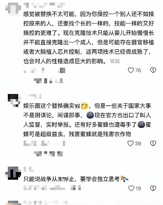 可以说现在大多数人骨子里都是愚昧无知的,不愿思考,只爱跟风起哄。别人说什么就信什么,越离谱的谣言越传得欢,固执己见,活在自己狭隘的认知里,还自以为很聪明。 明星有钱有资源,医美、微调、化妆、 变来变去再正常不过。真要做到完美替换一个人,以现在的技术根本不可能,声音、神态、微表情、习惯动作根本仿不出来。