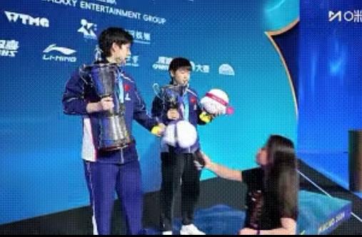 最搞笑的是奖杯小插曲🤣王楚钦盯着孙颖莎的奖杯一脸疑惑:“帽呢?!没帽啊”,孙颖莎笑着回怼“咱俩不一样”。