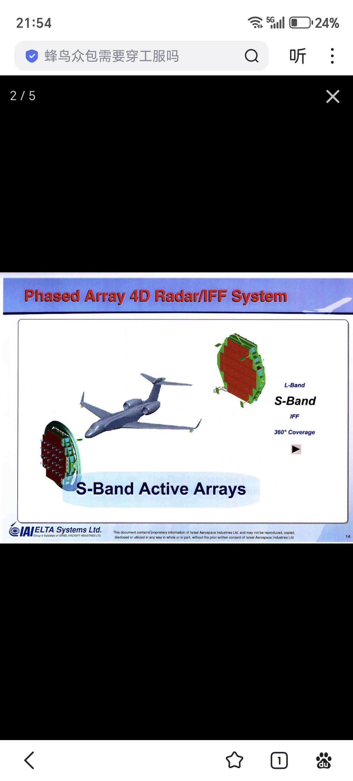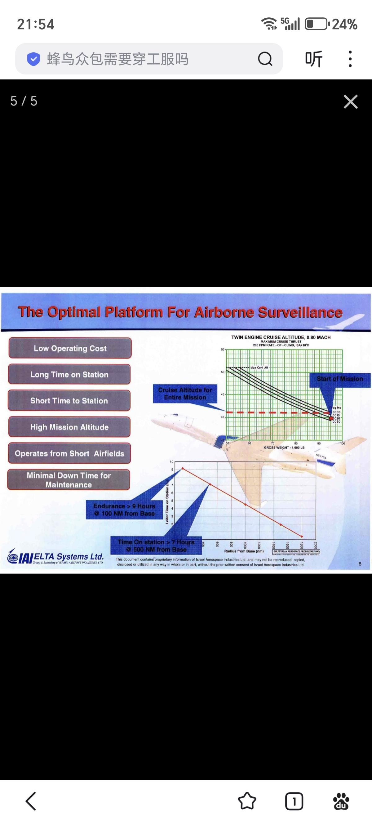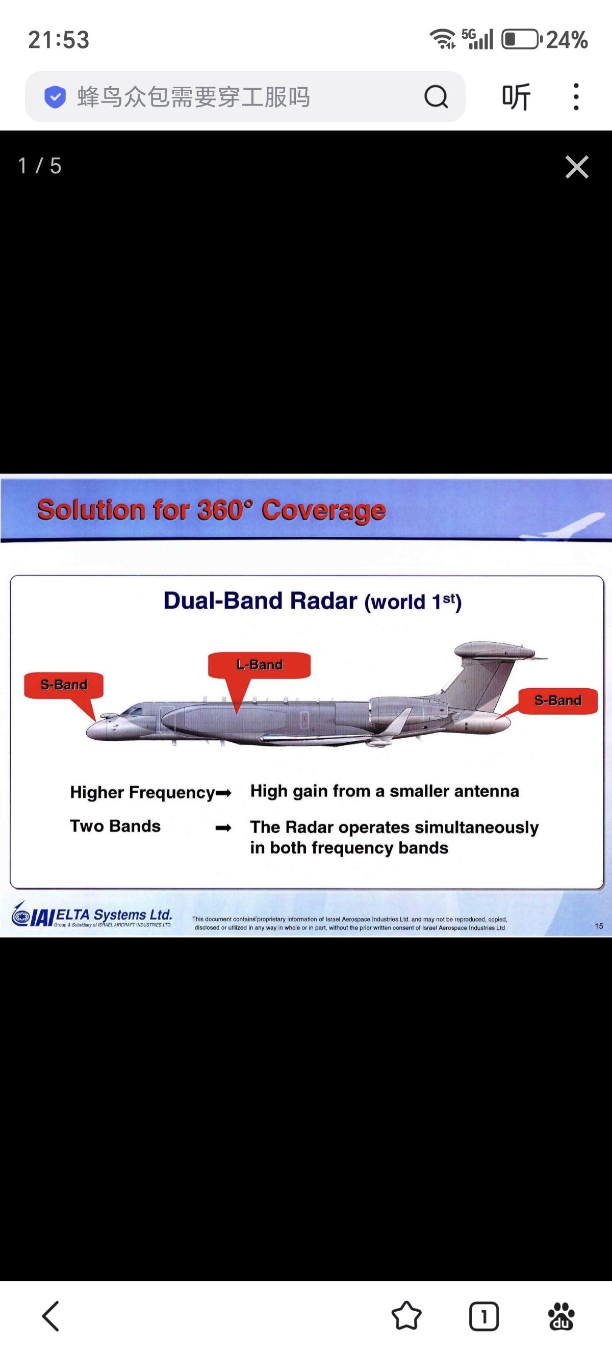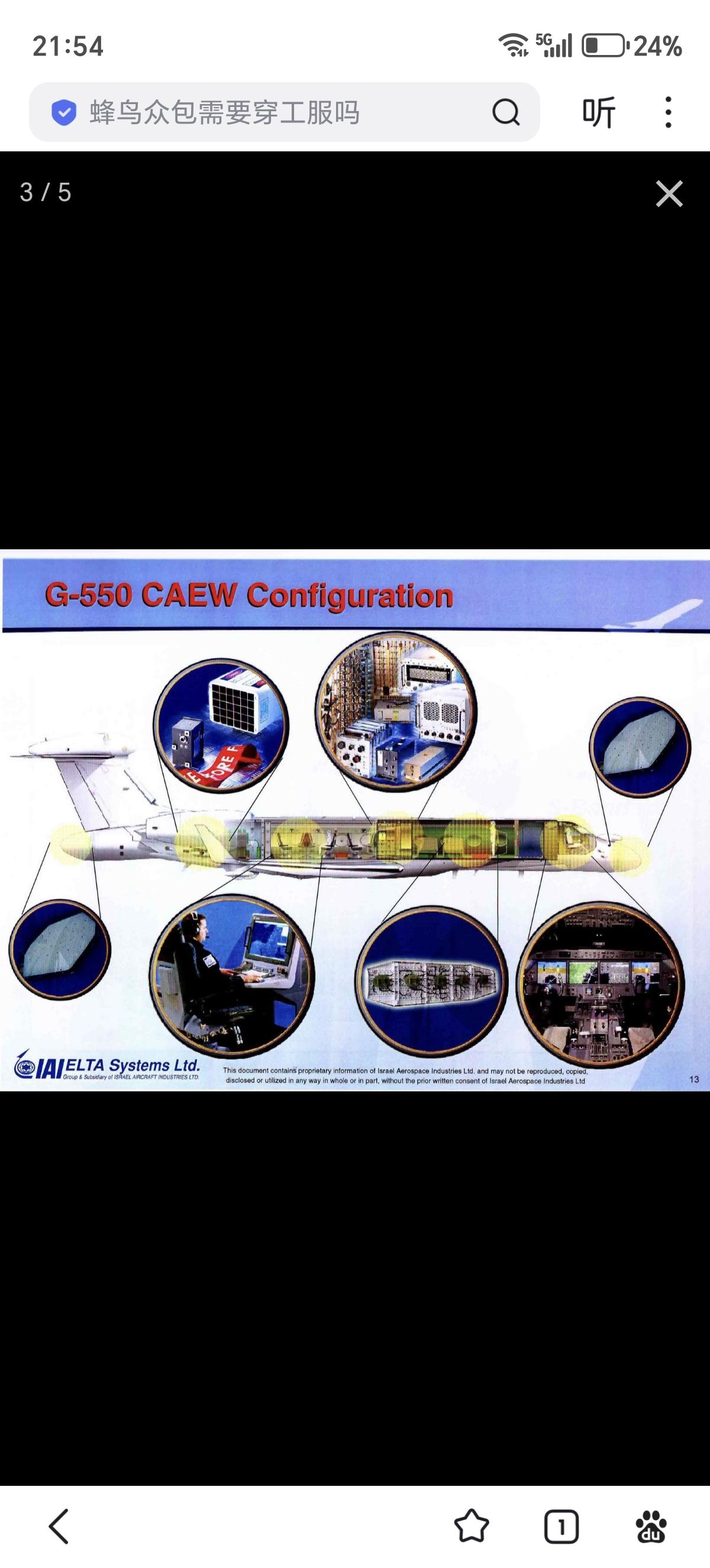 以色列 IAI/Elta EL/W-2085 (G550 CAEW) 预警机,基于湾流 G550 远程商务喷气式公务机,采用了EL/W-2085 S/L双波段 AESA 雷达提供360°覆盖。机身侧面有大型L波段共形天线,没有传统的天线罩,整体的气动性更好,对于飞机的性能影响较小