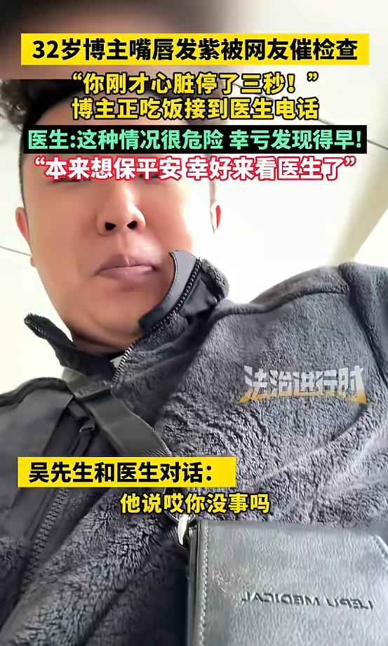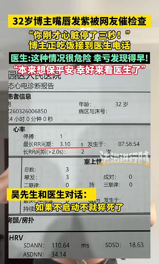 “不幸中的万幸!” 近日,吉林长春,一男子嘴唇发紫,网友看见后催他检查,当男子背上24 小时动态心电监测仪,他的心脏停搏了 2 次!但男子觉得自己没啥感觉,医生说如果当时男子有感觉的话,就猝死了!男子:感谢网友救我狗命! 最近吉林长春,32岁的吴先生算是捡回了一条命,说起来这事也挺巧,吴先生是个博主,平时经常分享日常,可有网友发现,他的嘴唇总是泛着青紫,看着就不对劲,评论区里一群人催他赶紧去医院检查,别不当回事。 吴先生一开始也没太在意,觉得自己身体好好的,不心慌不胸闷,吃嘛嘛香,嘴唇发紫可能就是天生的,或者最近没休息好。 架不住网友一遍遍提醒,语气都特别急切,他才半信半疑地去了医院,医生建议他背上24小时动态心电监测仪,看看心脏到底有没有问题。 谁能想到,就在监测的这24小时里,危险悄悄发生了,他的心脏竟然停搏了2次,最长的一次停了3秒,更让人后怕的是,吴先生全程没有任何感觉,该吃饭吃饭,该休息休息,完全不知道自己的心脏曾两次“罢工”。 等监测结果出来,医生拿着报告跟他说的话,让他瞬间冒了一身冷汗,医生说,他这种情况特别危险,心脏停搏就是心脏突然不跳了,要是当时他有感觉,比如头晕、眼前发黑,那大概率就猝死了,根本来不及抢救。 说白了,他没感觉反而是好事,也算是不幸中的万幸,吴先生后来回忆起来,也忍不住感慨,直言“感谢网友救我狗命”。 他说自己从来没想过,看着不起眼的嘴唇发紫,竟然藏着这么大的隐患,要是没有网友的热心提醒,他还会一直拖着,真等到有感觉的时候,一切就都晚了。 现在他已经听从医生的建议,准备安装心脏起搏器,以后也会戒烟戒酒,不再熬夜,好好保重身体,可能很多人都跟吴先生一样,觉得身体没不舒服就没事,嘴唇发紫要么是天生的,要么是冻的。 其实不是这样,嘴唇发紫在很多时候,就是身体发出的预警信号,说明血液里的氧气不够,背后可能藏着心脏或肺部的问题。 吴先生之所以没感觉,大概是因为心脏停搏的时间不算太长,加上他身体的代偿能力还不错,才没有出现明显症状,可这种无症状的停搏,反而更危险,因为它毫无征兆,你根本不知道下一次停搏会不会更长,会不会再也恢复不过来。 还有一点要提醒大家,平时常规体检里的心电图,只能抓取几十秒的心跳,像这种间歇发作的心脏停搏,根本查不出来,要是你也有嘴唇长期发紫,不管有没有不舒服,都建议去做一次24小时动态心电监测,别心存侥幸。 这次吴先生能捡回一条命,真的要感谢那些热心的网友,有时候一句善意的提醒,就能挽救一条生命,也希望大家都能多关注自己的身体信号,不要忽视那些看似不起眼的小异常,毕竟身体是自己的,平安健康才是最重要的。