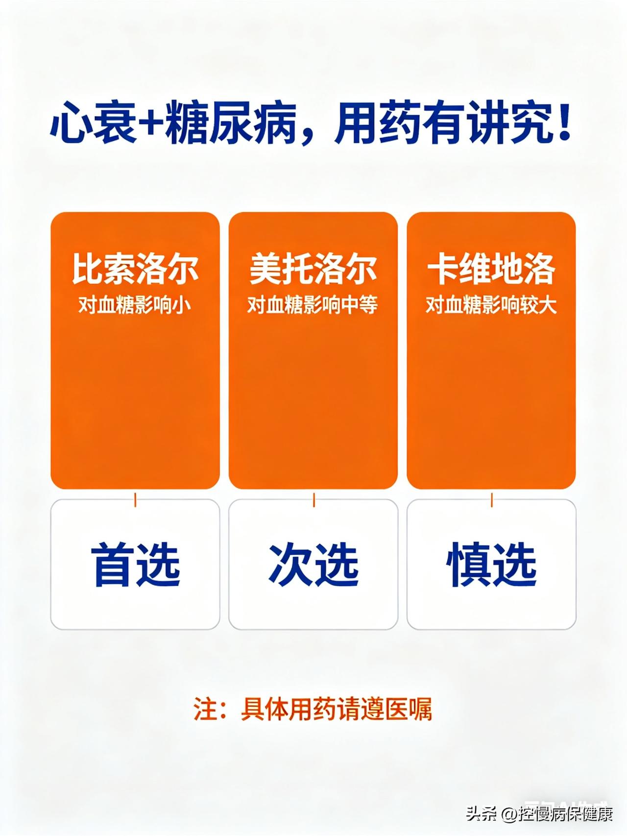 心衰遇上糖尿病,选药既要护心,又不能影响血糖!比索洛尔、美托洛尔、卡维地洛,对血糖影响差异大,选错易加重代谢负担👇 ✅ 首选:比索洛尔(高选择性,不扰糖脂) ✅ 核心优势:高选择性β1受体阻滞剂,几乎不影响糖代谢、脂代谢,不掩盖低血糖症状(心慌、手抖),是心衰合并糖尿病的最优解! ✅ 每日1次,耐受性好,长期用不升高血糖、不加重胰岛素抵抗,控心率护心同时,护代谢更安全。 ✅ 次选:美托洛尔缓释片(经典稳妥,影响较小) ✅ 优势:选择性较高,对血糖影响轻微,缓释剂型平稳控心率,临床数据足,性价比高,适合长期维持治疗。 ❌ 注意:普通片代谢快,偶可能轻微影响胰岛素敏感性,优先选缓释片,更适合血糖控制稳定的患者。 ❌ 慎选:卡维地洛(影响代谢,易掩盖低血糖) ✅ 虽护心效果强,但非选择性+扩血管,易掩盖低血糖心慌症状,还可能轻微降低胰岛素敏感性,升高甘油三酯。 ❌ 仅适合心衰极重、合并重度高血压,且血糖控制极佳的患者,需严密监测血糖血脂。 💡 糖心患者选药口诀 糖友心衰求安全 → 首选比索洛尔 血糖稳、求性价比 → 选美托洛尔缓释片 血糖波动大、怕低血糖 → 避开卡维地洛 ⚠️ 医生提醒:均需小剂量起始、缓慢加量,监测心率(55-60次/分)+血糖,严禁自行换药停药! 心衰征兆