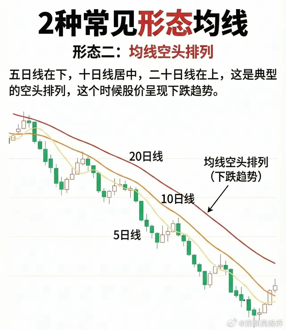两种常见均线形态解析(建议收藏研究)形态一:均线多头排列当5日、10日、20日均线依次向上发散,且呈现 “5日线在最上方、10日线居中、20日线在最下方” 的排列结构时,称为均线多头排列。这种形态通常预示着股价长期具备上涨动力,是典型的多头趋势信号。形态二:均线空头排列当5日、10日、20日均线呈现 “5日线在最下方、10日线居中、20日线在最上方” 的向下发散结构时,称为均线空头排列。这种形态下,股价往往处于下跌趋势中,是典型的空头趋势信号。(注:配图中,多头排列的K线伴随均线同步向上,空头排列的K线伴随均线同步向下,直观呈现趋势特征。)通过均线的排列方向(向上/向下)和层级关系(短、中、长期均线的相对位置),可快速判断股价的中长期趋势,为交易决策提供参考。