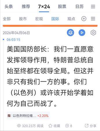 罕见!最新消息,美防长:以色列,或许该开始学着如何为自己而战了 当地时间4月5日,在特朗普再宣最后通牒和美军再度折损数架军机的背景下,据财经快讯称,美国国防部长赫格塞思突然对外表示,以色列,或许该开始学着如何为自己而战了 他的原话是: “我们一直愿意发挥领导作用,特朗普总统自始至终都在领导全局。但这并非只有我们一方的事。你们(以色列)或许该开始学着如何为自己而战了” 截止目前,相关方暂无回应或评论 不过,据公开资料显示,自开战以来(现历经37天),这还是美防长首次这样表态:“以色列,或许该开始学着如何为自己而战了” 就在同一天,特朗普刚给伊朗下了最后通牒,放狠话要在4月7日炸平伊朗全境的发电厂和大桥,还威胁"打开那个该死的海峡,否则你们将活在地狱中"。 更巧的是,美军最近在伊朗上空连遭重创,一架F-15E战机3日被击落,随后又丢了2架C-130运输机、1架A-10攻击机、4架黑鹰直升机、2架小鸟直升机和2架MQ-9无人机,损失相当惨重。一边是美军折戟沉沙,一边是以色列还在添乱,美国这心态能不变吗? 要知道,3月7日以色列就擅自空袭了伊朗油气设施,当时就把特朗普当局惹毛了。 美方事后赶紧出来撇清,说这事儿没跟他们商量,还摆出三点理由叫停这类行动:一是怕伊朗民众更团结,二是特朗普想战后跟伊朗搞石油合作得留着资产,三是怕战事升级连累海湾盟友。那会儿美以分歧就已经摆上台面,只是没撕破脸。 赫格塞思的原话也很有讲究,他说"我们一直愿意发挥领导作用,特朗普总统自始至终都在领导全局。但这并非只有我们一方的事"。这话听着客气,实则透着一股不耐烦——意思就是我们帮你够多了,别总指望我们当冤大头。 开战以来,美国不仅给以色列提供情报、武器,还直接下场参战,结果以色列倒好,自己偷偷搞事情,完全不把美国的战略考量当回事。 最让人看不懂的是特朗普这边的迷之操作。一边让防长敲打以色列,一边自己对伊朗放狠话,这葫芦里卖的什么药?明眼人都能看出来,美国现在是骑虎难下。 开战前特朗普想速战速决,结果打了快六周,伊朗没垮,反而把霍尔木兹海峡一封,全球油价涨得飞起,美国国内通胀压力也跟着上来。更要命的是,美军伤亡数字不断攀升,国内反战声音越来越大,这对特朗普的大选前景可不是好事。 美国和以色列的核心矛盾早就不是"要不要打伊朗",而是"怎么收场"的问题。以色列想借美国的手彻底搞垮伊朗,永绝后患,最好能把内塔尼亚胡的支持率再往上推推。 但美国想的是赶紧达成协议,打开海峡,控制损失,好把精力转回亚太对付中国。这种战略分歧越拖越明显,赫格塞思的话就是美国摊牌的信号——再不听话,我们可要撤梯子了。 有人可能会问,美国真能不管以色列吗?答案是既想管又不想管。以色列毕竟是美国在中东的核心盟友,真出事了美国不能坐视不理。 但现在的情况是,美国自己都快撑不住了,哪还有力气一直罩着以色列?特朗普一边对伊朗放狠话,一边其实一直在推迟"摧毁"行动的时间,从3月中旬推到4月6日,现在又暗示要到4月7日,这犹豫劲儿已经很说明问题了。 还有个细节值得琢磨,赫格塞思3月31日还说当前"首要任务"是寻求协议结束战事,怎么才过几天就变了口风?这背后肯定有特朗普的授意。美国现在是想两手抓:一手用军事威胁逼伊朗就范,一手敲打以色列别添乱,好让谈判能顺利进行。毕竟再打下去,美国的家底都要被掏空了。 说实在的,以色列也该醒醒了。仗打了快六周,伊朗的导弹和无人机还在飞,核设施也没被彻底摧毁,反而把美国拖进了泥潭。 赫格塞思的话就是提醒以色列,别总想着搭美国的顺风车,自己也得承担点责任。毕竟天下没有免费的午餐,美国的支持也不是无底洞。 你说这事儿怪不怪?一边是美国防长敲打盟友,一边是总统对敌人放狠话,这操作放在以前真是少见。这恰恰反映了美国当前的困境——既想维护霸权,又没足够的实力和耐心,只能在盟友和对手之间反复横跳。 至于以色列听不听劝,伊朗会不会就范,4月7日这个时间点一过,答案就该揭晓了。只是这中东的乱局,怕是没那么容易收场。