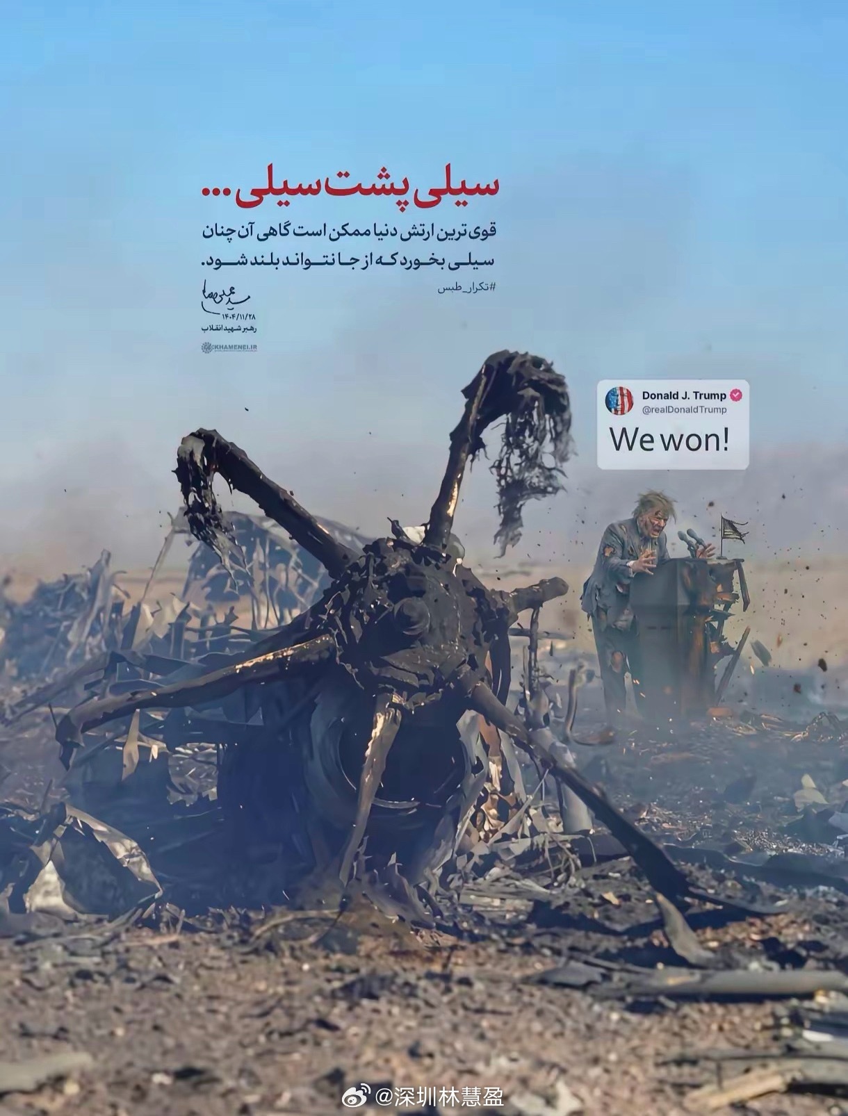 一世鹰名毁于伊弹今天上午就看到伊朗的宣传机器全面开动,伊朗驻外使领馆都在发布嘲讽美国的海报。存了几张。比如图2,文案是一巴掌又一巴掌。² 大意是,1980年美军营救伊朗人质,直升机坠毁、任务失败。2026年美军营救美军,又直升机坠毁,这一次还有运输机、战斗机被摧毁,一地狼籍。³ 感到这是强行赢了的宣传调性。试问2026年的弹坑在谁的土地上?怎么会让美军成群结队进入自己的领土?一个人带刀带枪闯了进来,杀人进度完成了80%,刀断了,枪管热了,这个人全身而退,大概率还会把经过拍成段子,让好莱坞满世界播送。这时候袒露着新鲜刀口、枪伤,躺在一大片尚未干透的血污里嘲讽美国,这里面“赢”的逻辑是什么??⁴ 割草战略。人家轰炸的目的就是每隔一段时间剪伐一遍,不让你日子好过啊。