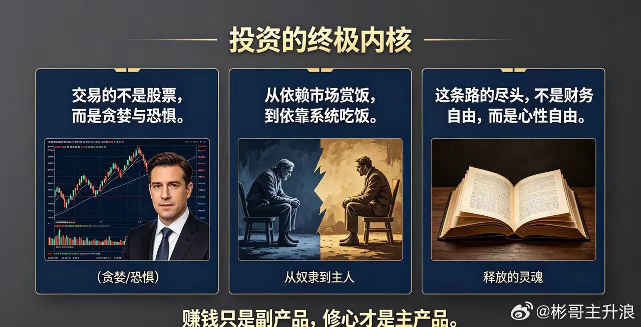 投资的终极内核交易的不是股票,而是贪婪与恐惧。这句话,是所有高手的墓志铭,也是所有赢家的通行证。从依赖市场赏饭,到依靠系统吃饭。这是从奴隶到主人的蜕变,是从被动到主动的觉醒。这条路的尽头,不是财务自由,而是心性自由。这才是最高级的通透。你已经明白:赚钱只是副产品,修心才是主产品。