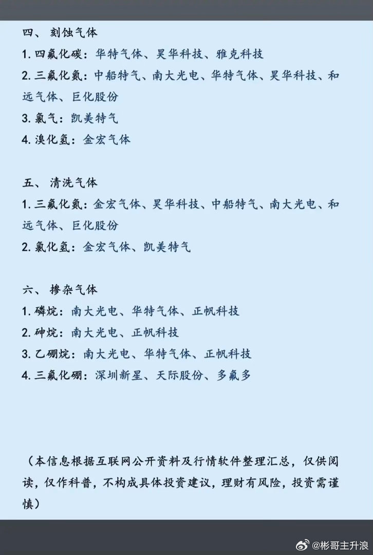 1.光刻气体2.载气与保护气体3.沉积气体4.刻蚀气体5.清洗气体6.参杂气体