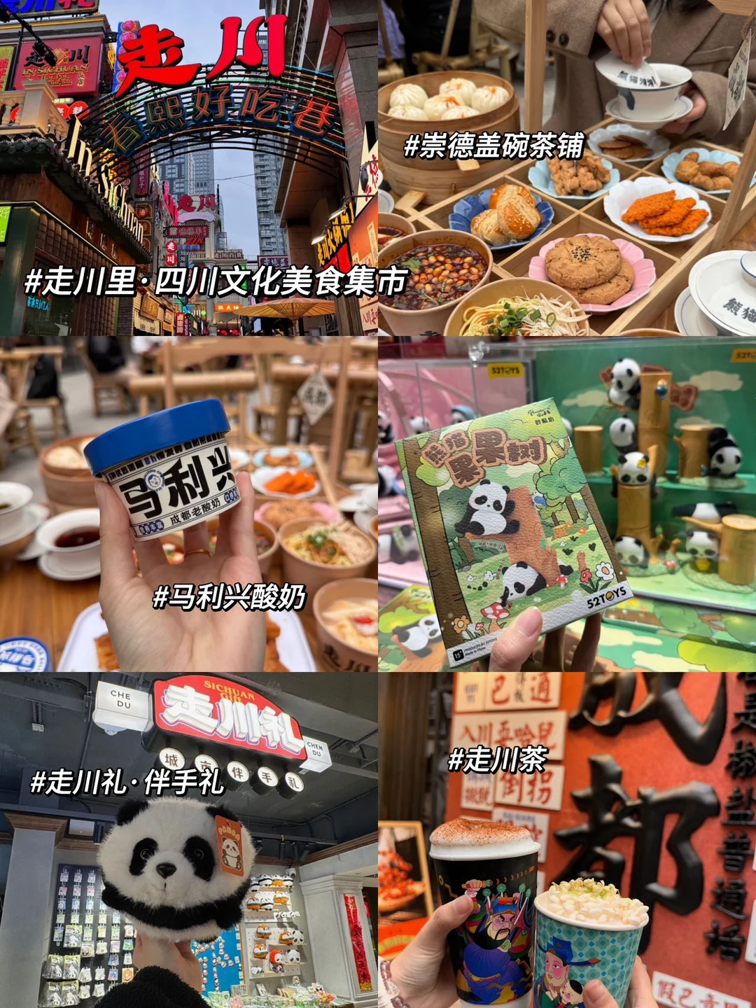 📍 走川里·四川文化美食集市:里面汇集了多家成都的特色小吃!像走川茶、马利兴酸奶、崇德盖碗茶铺…这些都很值得打卡✅而且这还能买到成都的伴手礼哦~