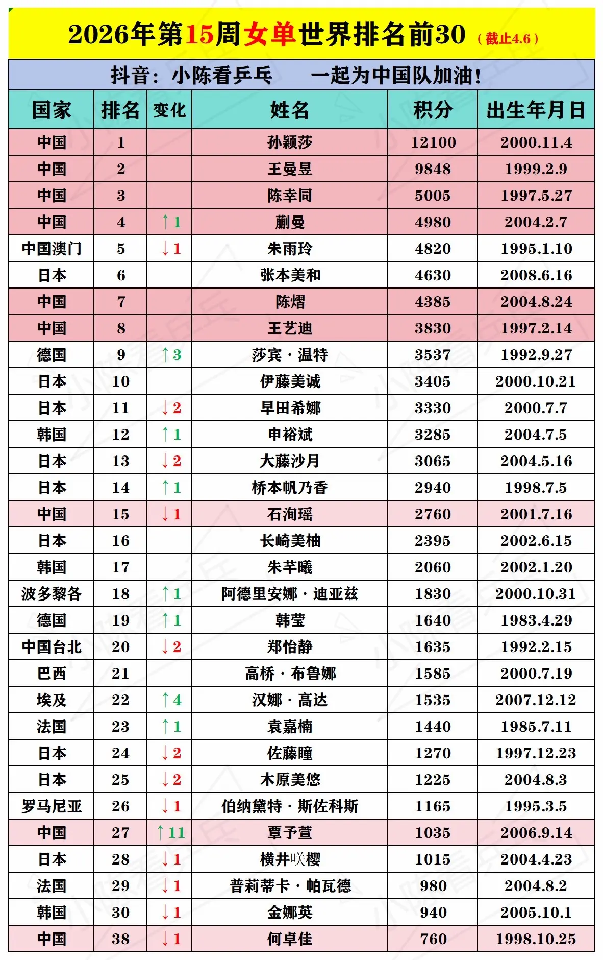2026第15周男女单世界排名前30。2026第15周男女单世界排名前30更新,中国队继续加油。